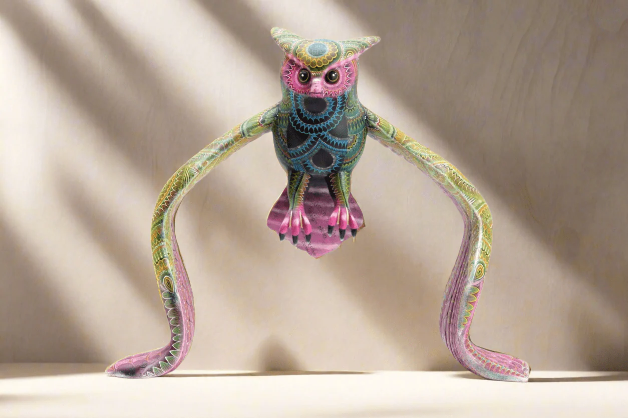 El Búho Real es un alebrije que invita a la contemplación y la serenidad. Esta figura nocturna se presenta con alas extendidas, como si estuviera en vuelo, pero en realidad está apoyada sobre el suelo. La madera de copal y la pintura a mano han sido combinadas para crear un efecto visual que evoca la noche estrellada.