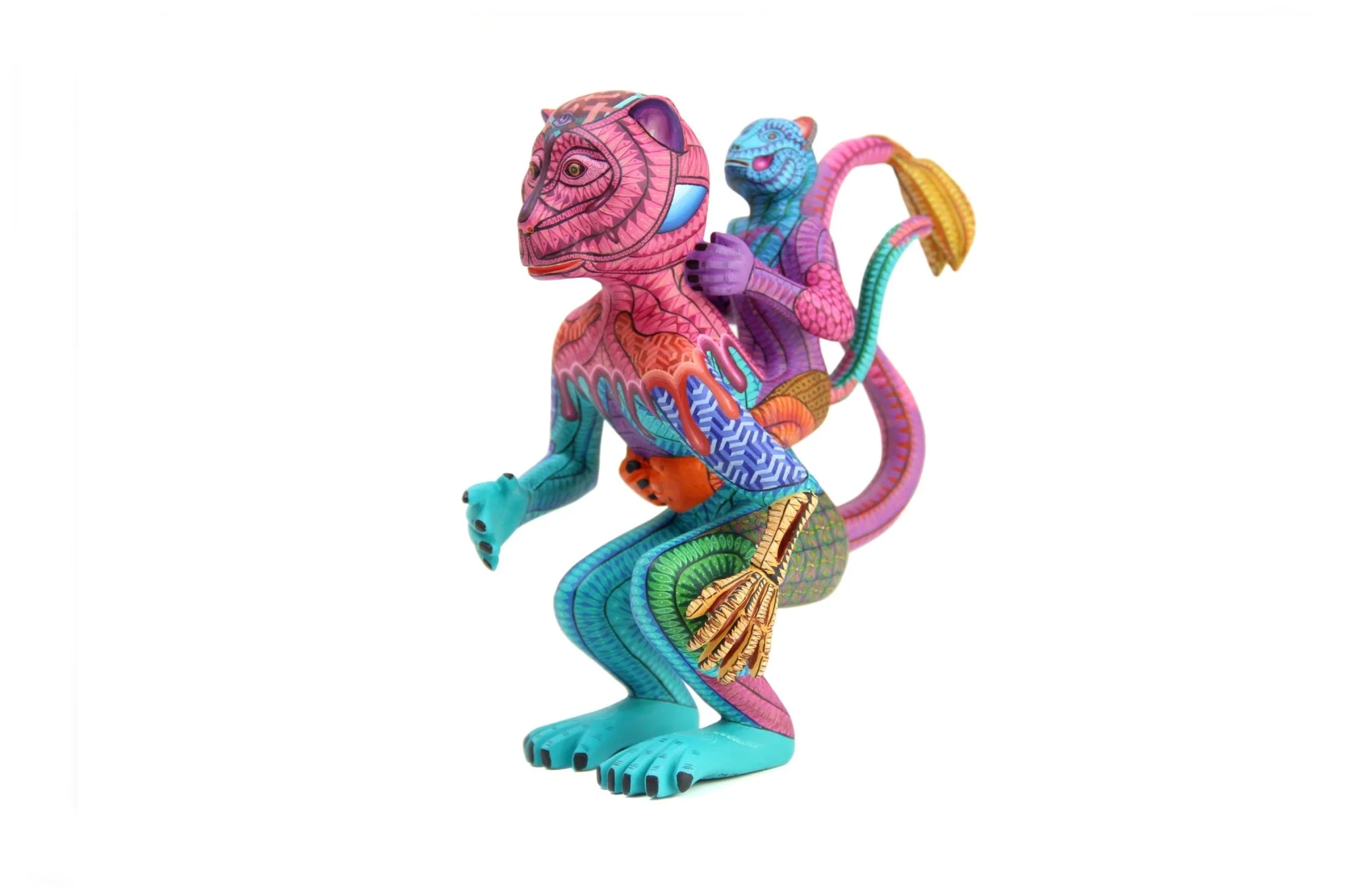 El cuerpo del chango está pintado en tonos rosa brillante, mientras que la parte inferior está en tonos turquesas claros, separados por formas de gotas que recuerdan a la pintura. La cría que va sobre la espalda del chango es un toque de colorido y textura adicional, con varios colores que se mezclan para crear un efecto visual rico.