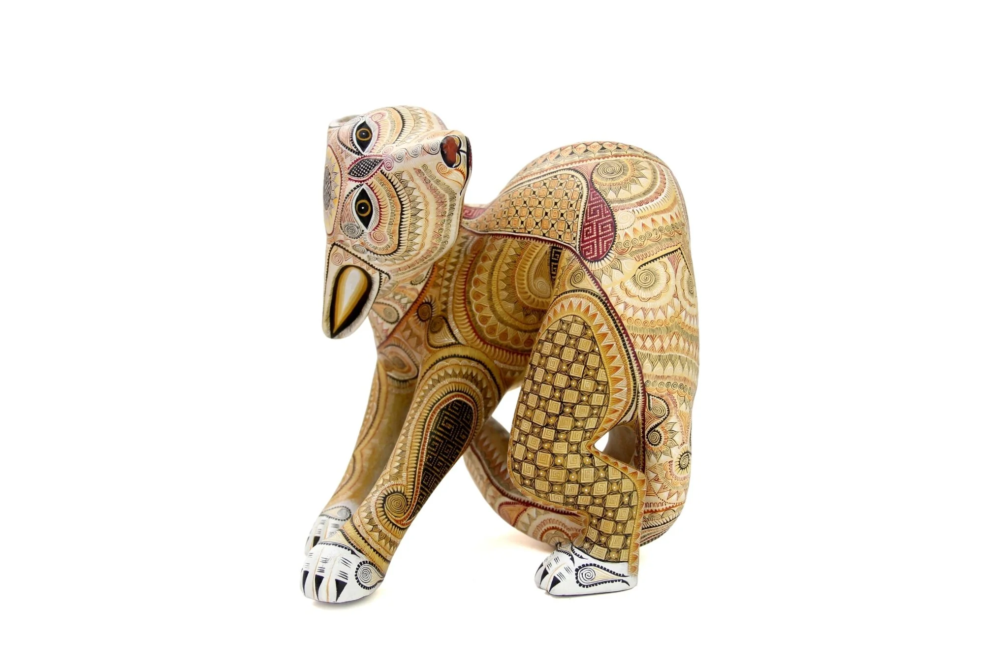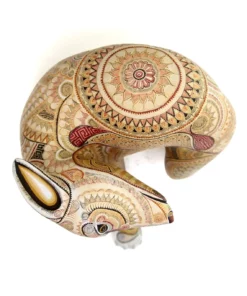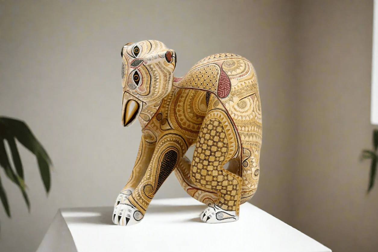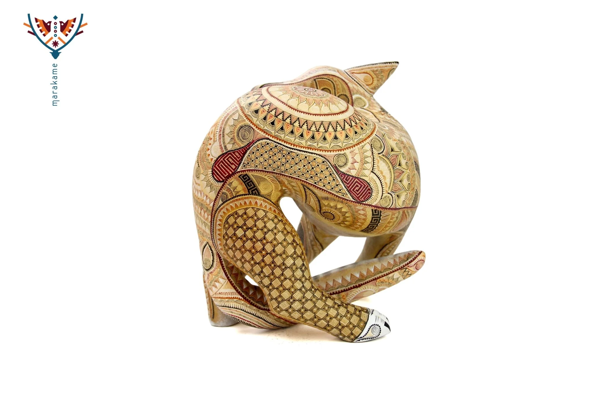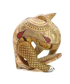 El Coyote es un verdadero espectáculo visual, donde la energía y la creatividad se mezclan para crear una obra de arte única. El cuerpo del coyote está pintado en tonos amarillos brillantes, lo que le da un toque de vitalidad y movimiento. La posición de movimiento girando la cabeza es como si el coyote mismo estuviera vivo y en acción, lo que agrega un toque de dinamismo y energía al alebrije. Los detalles de los símbolos zapotecos y las formas geométricas que adornan todo su cuerpo son como pequeñas joyas que resaltan la belleza y la complejidad de esta obra de arte.