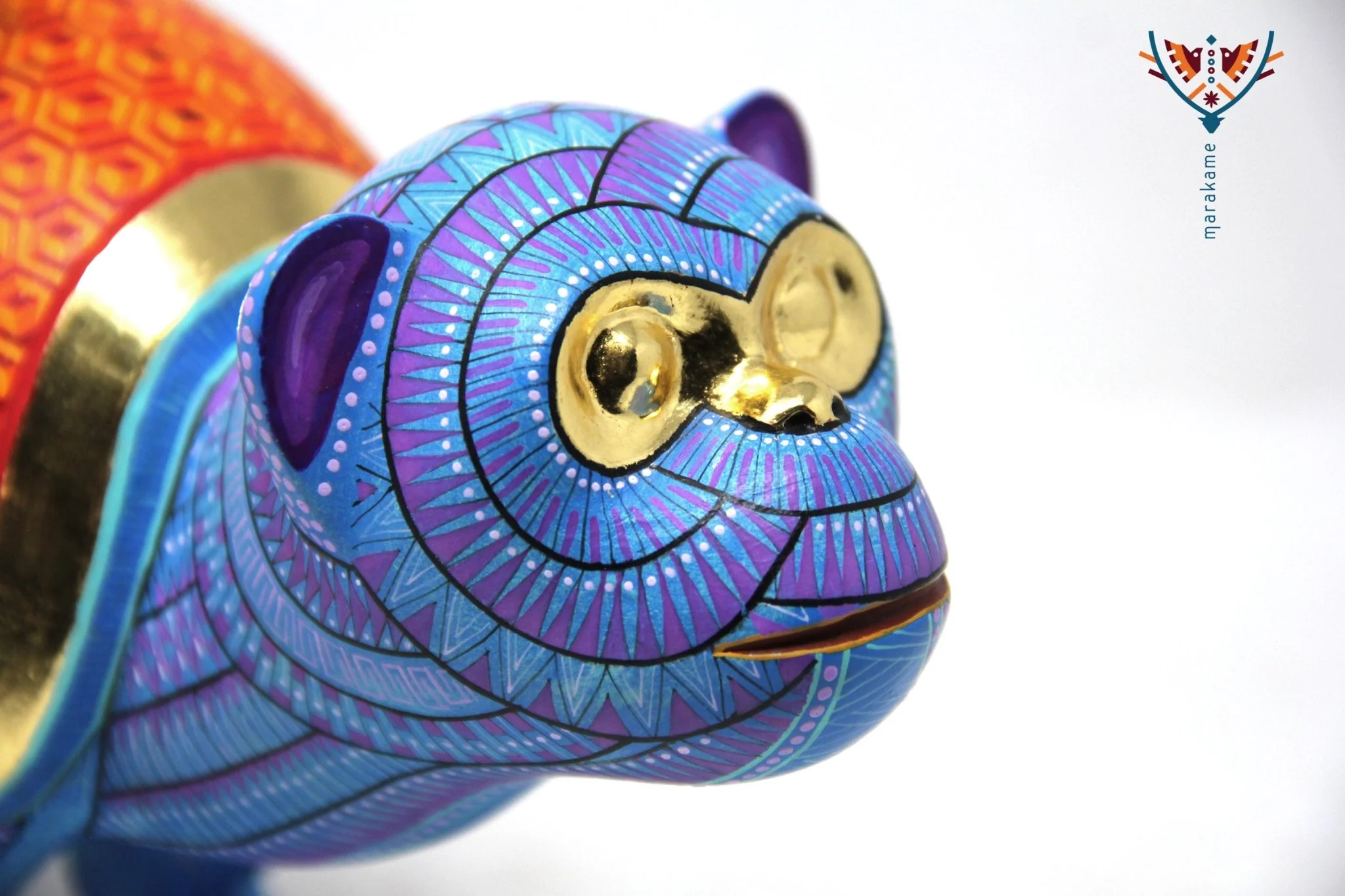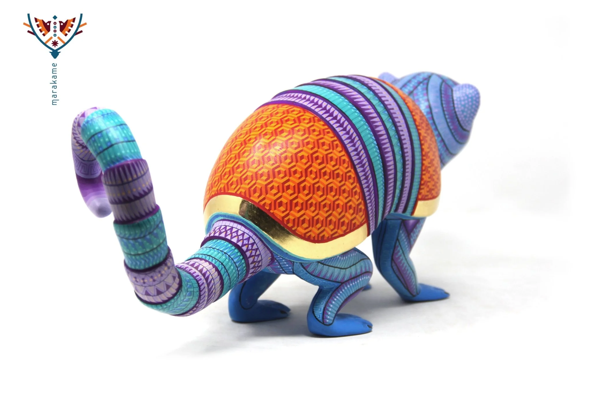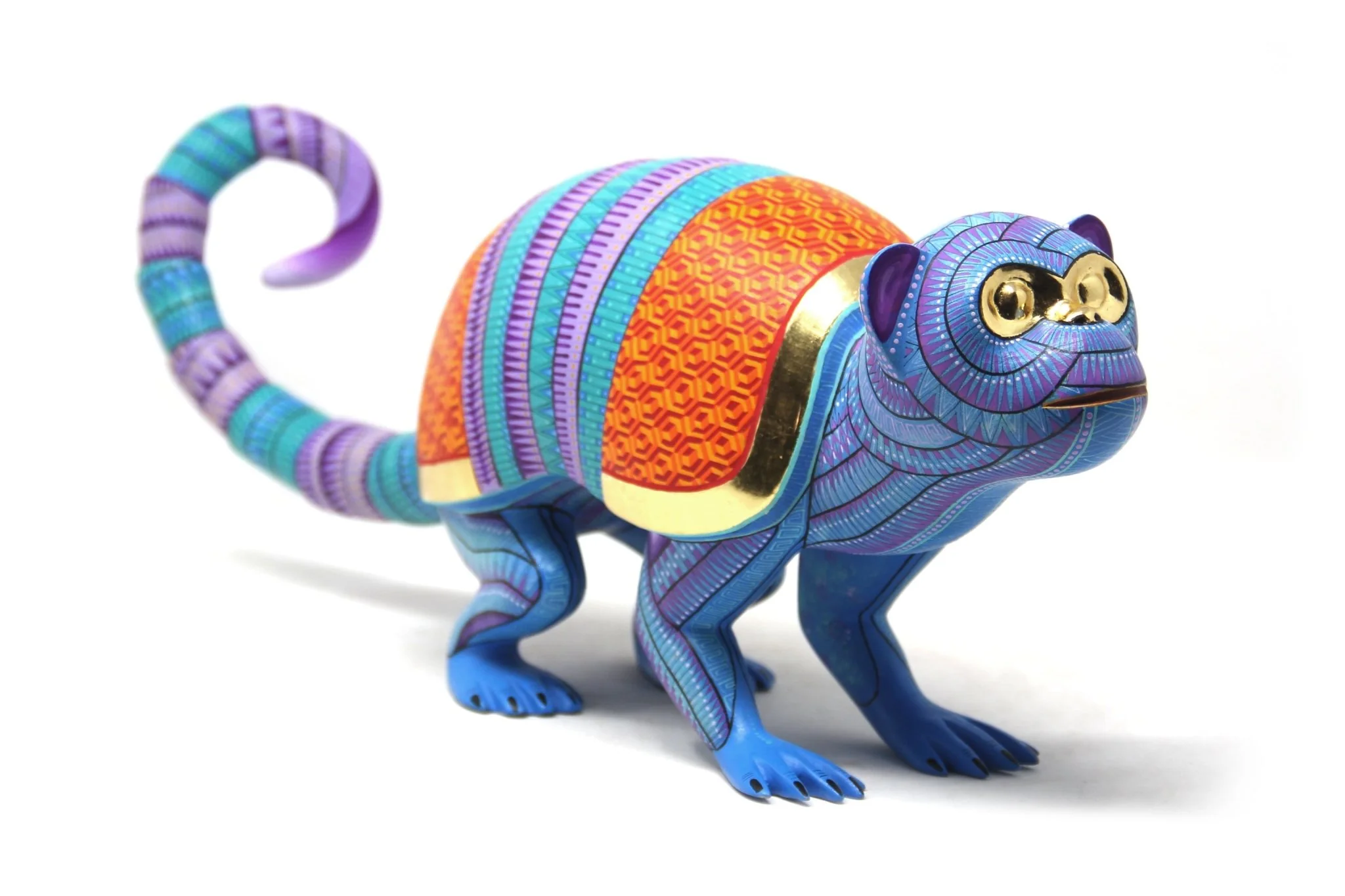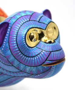 Un alebrije que fusiona la energía y la creatividad del arte oaxaqueño. El Simio Armadillo es un objeto decorativo impresionante que combina la frescura de los azules con el calor de los morados y naranjas, creando un efecto visual vibrante y emocionante. Los detalles en pintura reflejan una pasión por la creatividad y la imaginación, mientras que el material dorado reflejante en los ojos y el contorno del caparazón añaden un toque de lujo y elegancia.