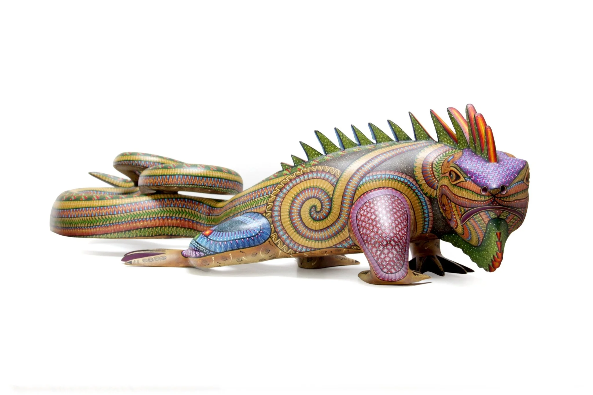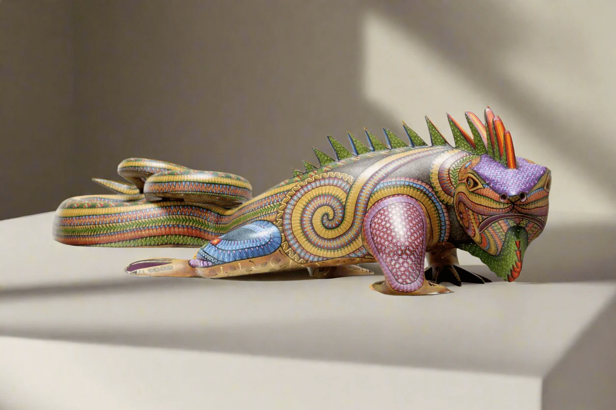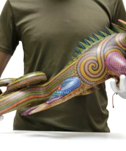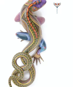 Las espinas verdes que cubren el cuerpo de la Iguana agregan un toque de complejidad y profundidad al diseño. La textura de la madera y la pintura a mano con técnicas tradicionales proporcionan un efecto visual único, mientras que los colores vivos añaden energía y vitalidad. Cada pieza es una obra de arte única, resultado del talento y la creatividad de los artesanos oaxaqueños. Esta pieza es perfecta para cualquier coleccionista que aprecie el arte popular mexicano.