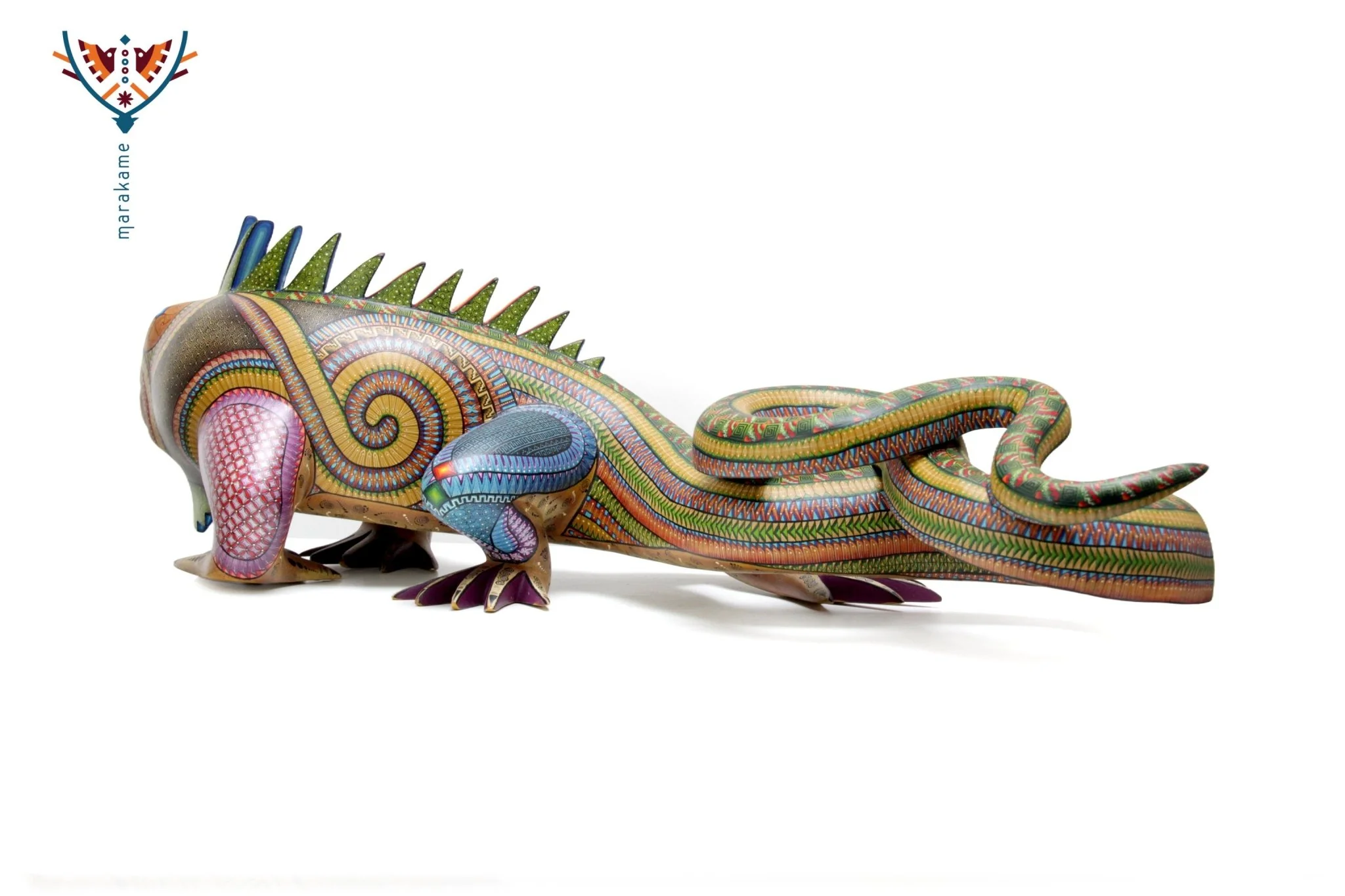 Esta selección especial de Alebrije oaxaqueño comisionada por Marakame a los mejores autores de alebrije moderno, es pintado a mano sobre talla en madera del árbol de copal (Bursera, spp), el cual crece a los alrededores de las comunidades de San Martín Tilcajete y San Antonio Arrazola, localidades de la región Zapoteca del Estado de Oaxaca, en el Sur de México. También se utiliza de forma común la talla en madera de cedro por las características de esta madera.