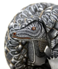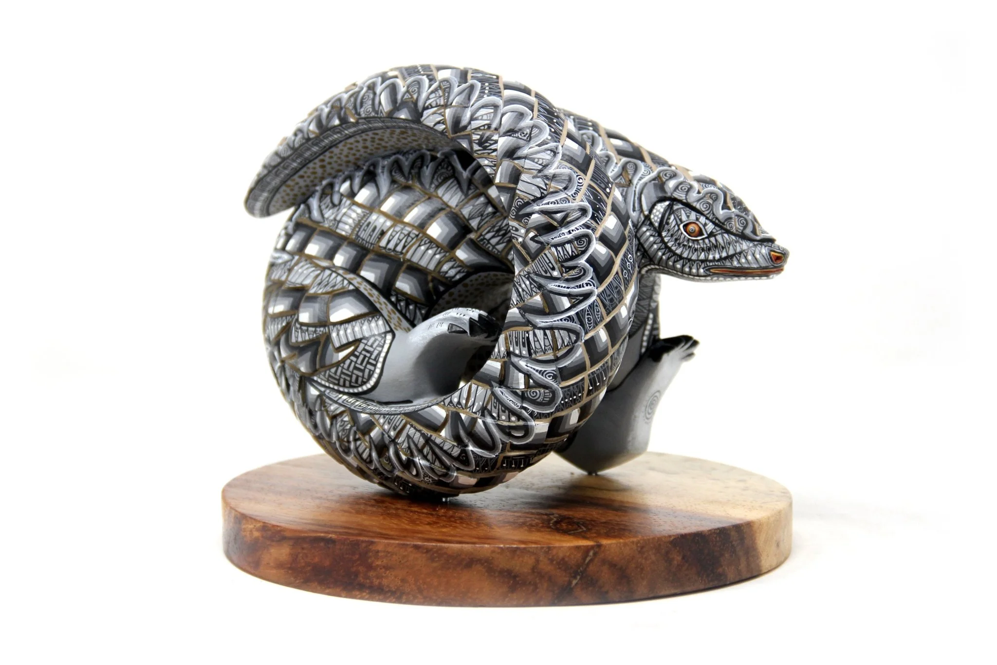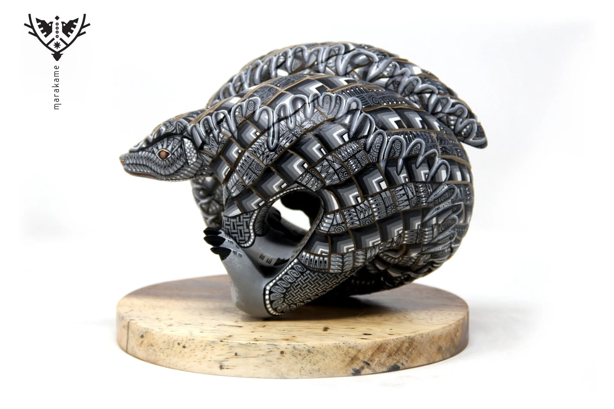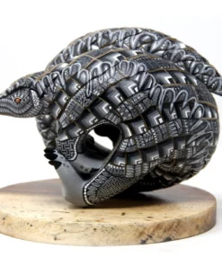 La figura del pangolín, un animal mitológico mexicano, se presenta con detalles delicados y precisos en su estructura, creando un efecto visual único. La base de madera es un toque adicional que agrega profundidad y complejidad a esta obra de arte. El Alebrije – Pangolín Bolita es perfecto para aquellos que buscan un objeto decorativo que combine la simplicidad con la elegancia, y que inviten al espectador a explorar la rica cultura y mitología mexicana.