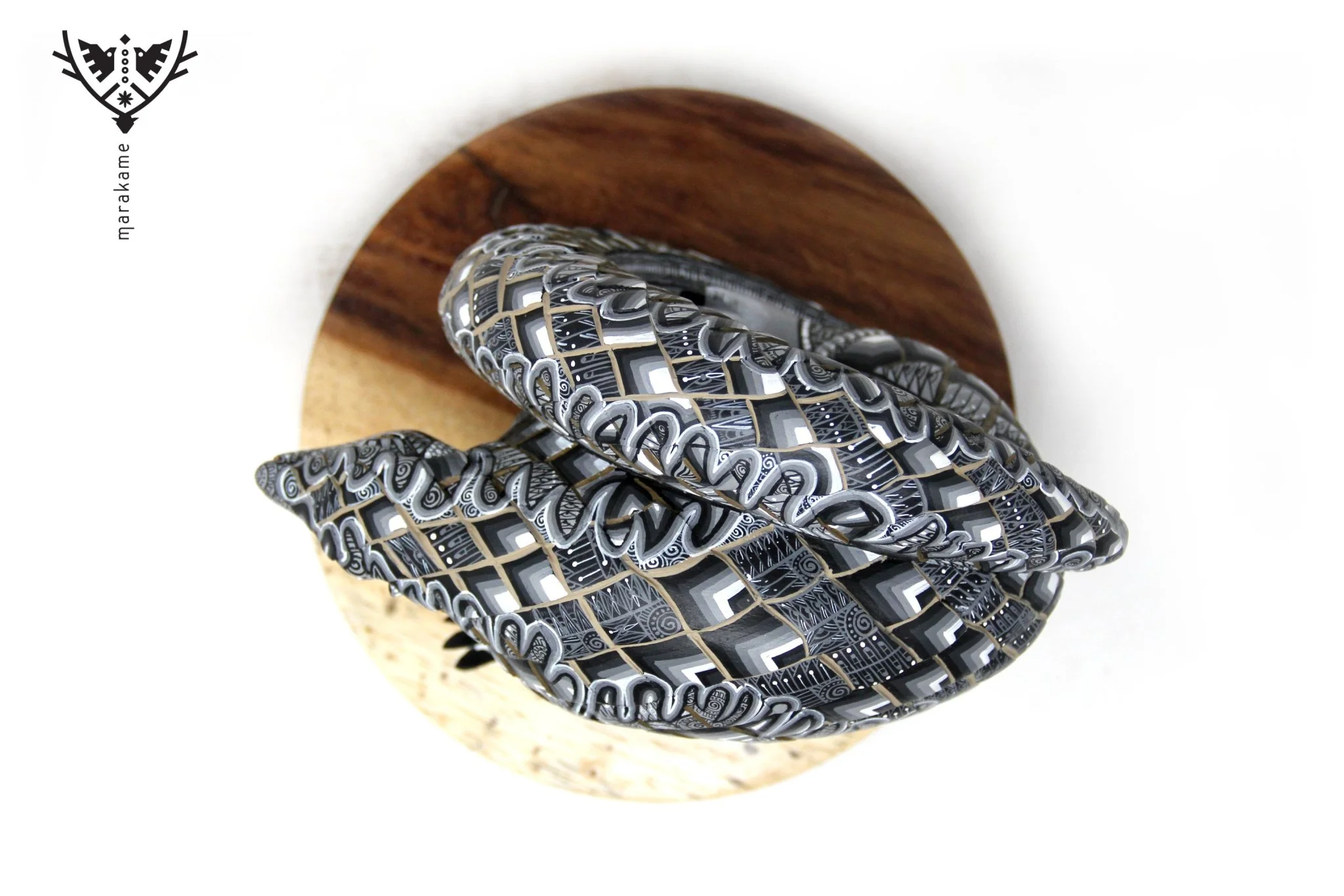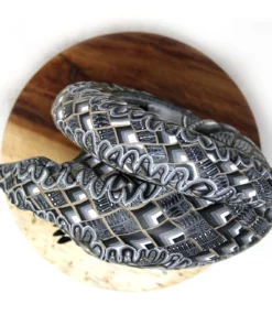 Descubre la pureza y la sencillez en este alebrije que combina la oscuridad y la luz. El Alebrije – Pangolín Bolita presenta un cuerpo negro y blanco, con una base de madera que se divide entre tonos oscuros y claros. La textura natural de la madera es visible en la parte superior, mientras que la pintura a mano crea un contraste interesante en la parte inferior.
