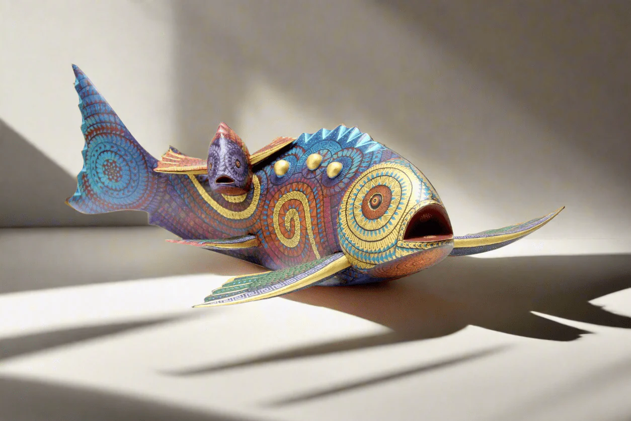 La cría del pez, ubicada arriba del cuerpo principal, es un toque emocionante que agrega vida y energía al alebrije. La madera suave y la pintura a mano con técnicas tradicionales crean un efecto visual único y emotivo. Es como si el pez mismo estuviera nadando en el agua, con una energía vital que fluye a través de cada curva y línea. Este alebrije es un objeto que invita al espectador a conectarse con el mundo marino y disfrutar de la hermosa diversidad de la vida submarina.