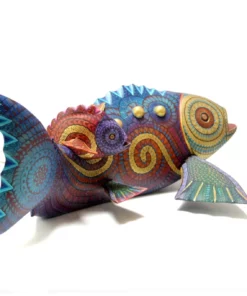 Este alebrije Pez con cría es un verdadero ejemplo de belleza y creatividad. La figura del pez está pintada en múltiples tonos azules y rojizos, creando un efecto visual vibrante y dinámico. Las formas curvilíneas y las espirales que rodean el cuerpo del pez son como pequeñas olas que fluyen a través de él, invocando la sensación de movimiento y agua.