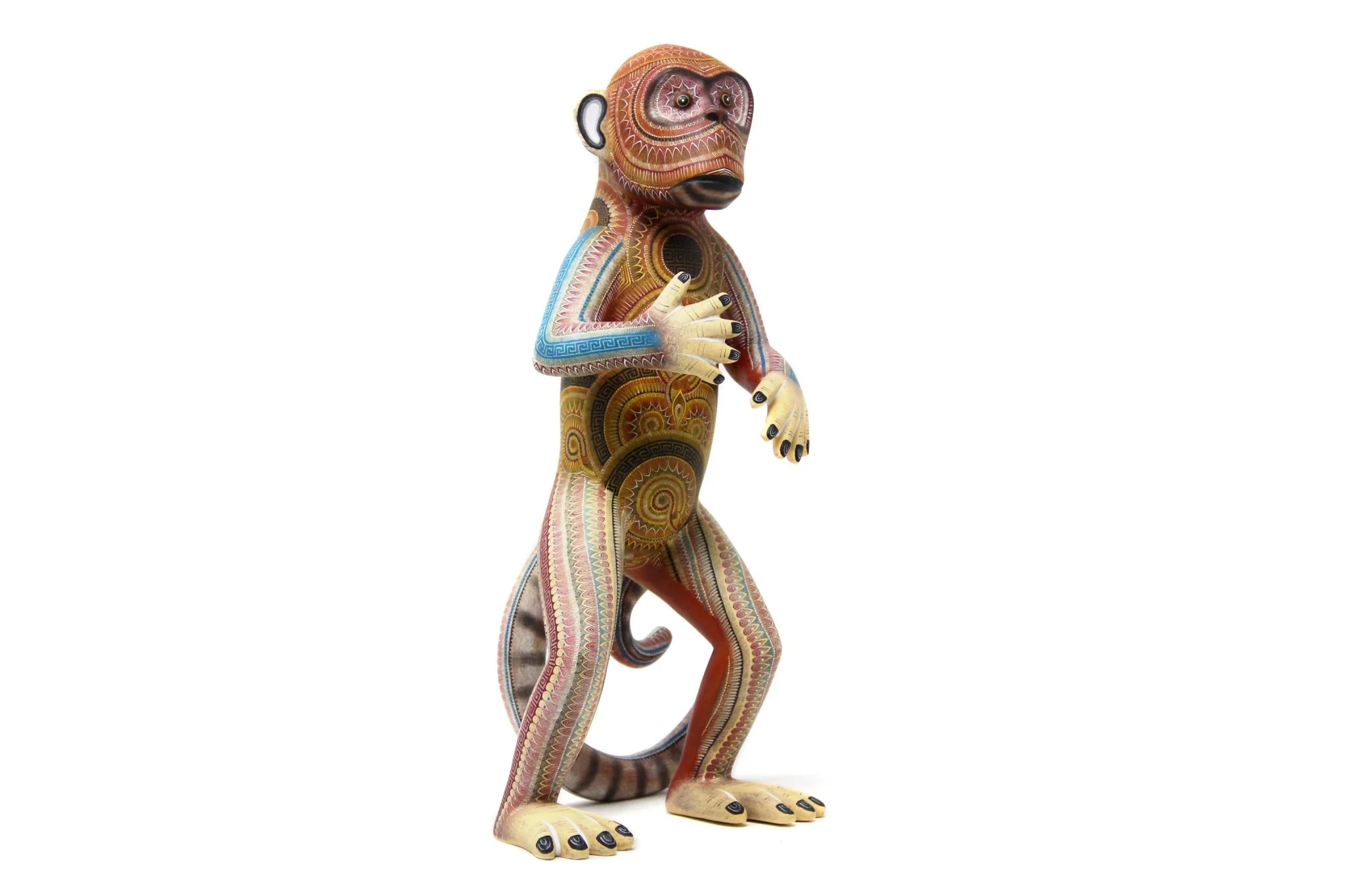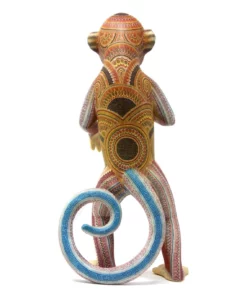 En el mundo animal, donde la sabiduría y la conexión con los demás son fundamentales, se encuentra este hermoso alebrije. La figura del simio se presenta en postura erguida sobre dos patas, con la cola enroscada para mostrar su agilidad y equilibrio.