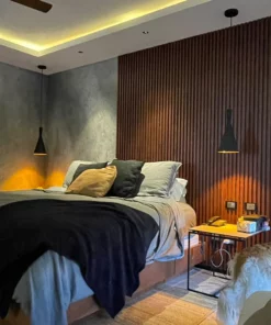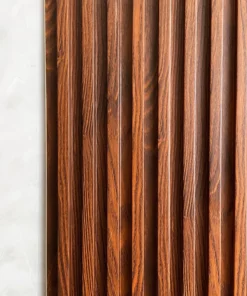 Lambrín Interior WIDE Color Nogal. El panel WPC para interiores está compuesto por un 60% de resina de madera y un 40% de PVC, y está acabado con un revestimiento de impresión texturizado que le confiere el aspecto de la madera.