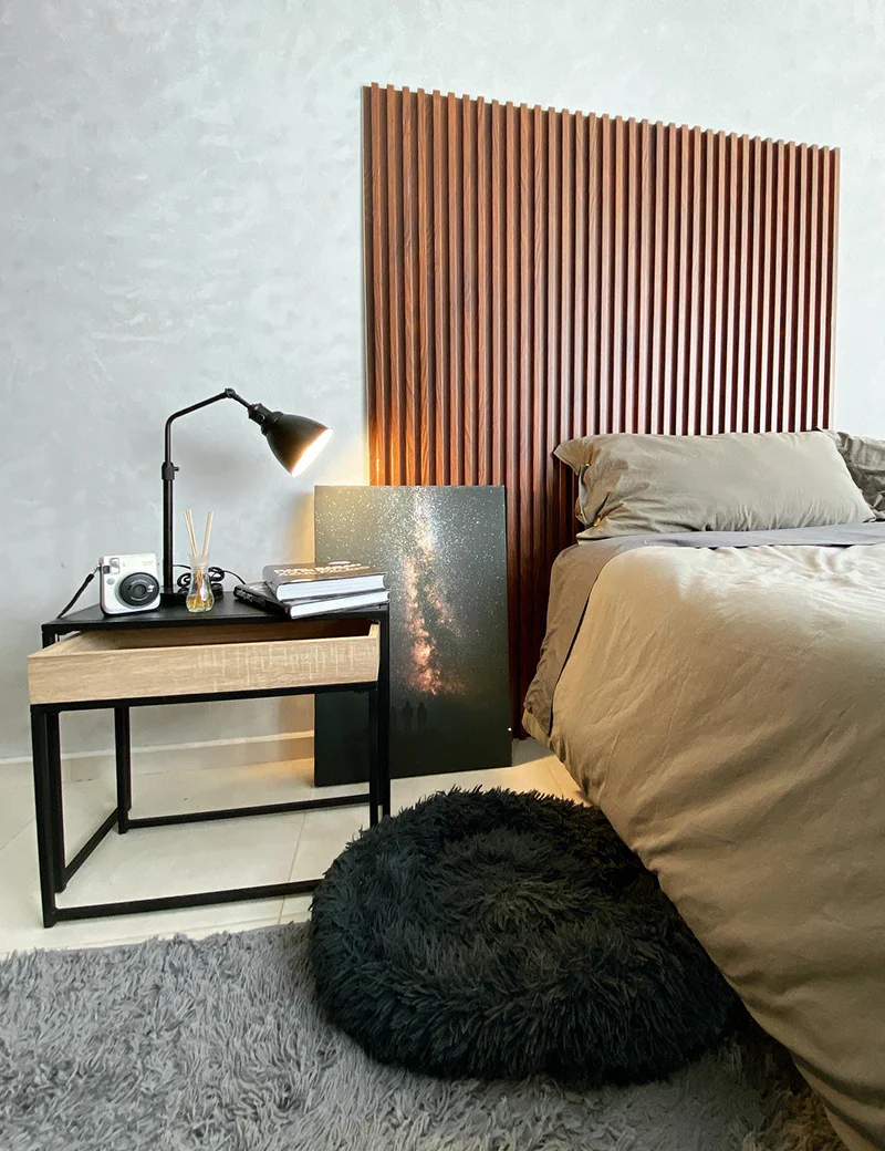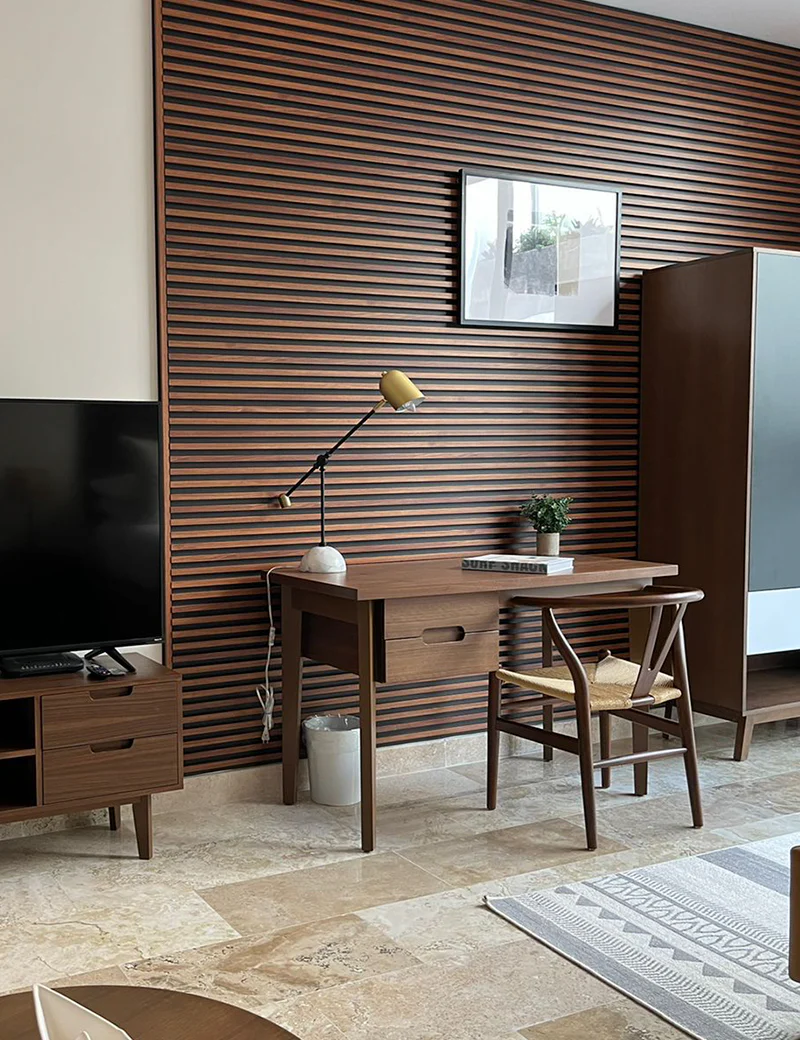 Lambrín Interior WIDE Color Nogal Expresso. El panel WPC para interiores está compuesto por un 60% de resina de madera y un 40% de PVC, y está acabado con un revestimiento de impresión texturizado que le confiere el aspecto de la madera.
