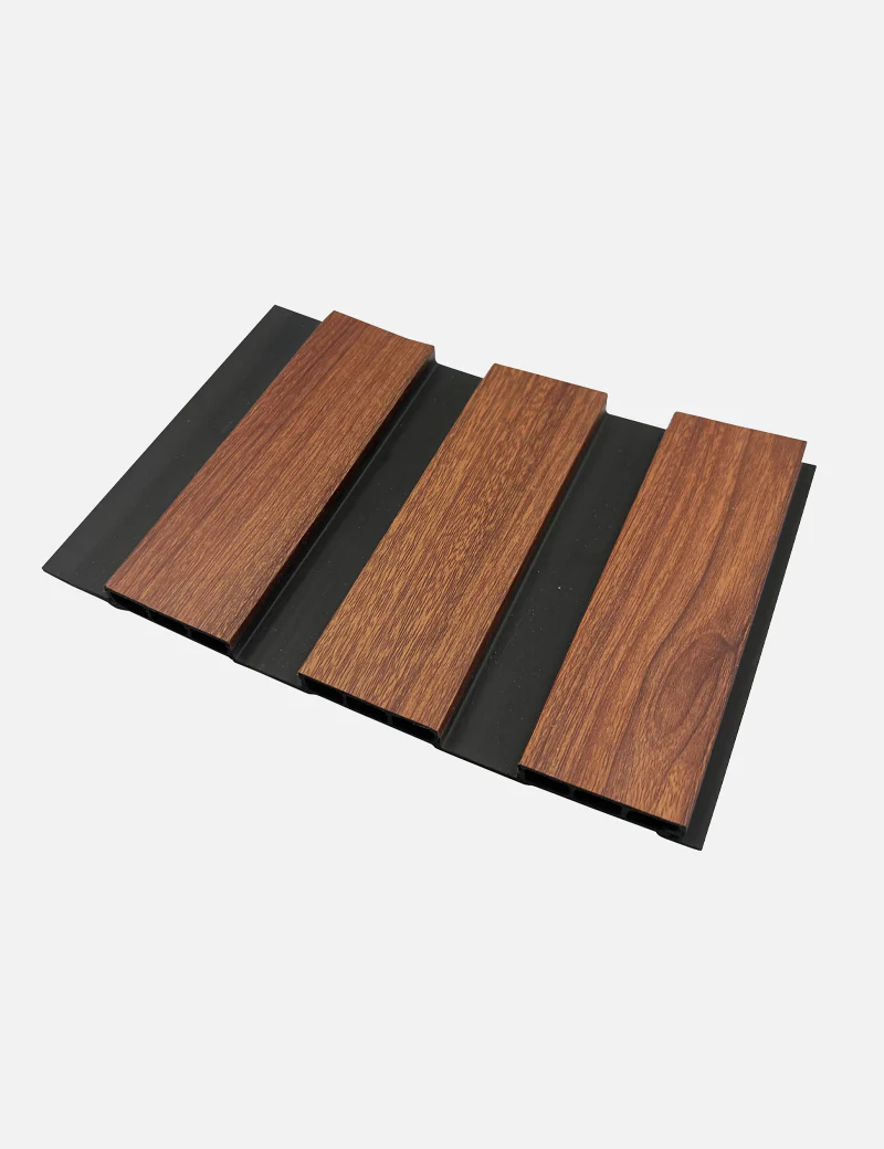 Lambrín Interior WIDE Color Parota fondo negro. El panel WPC para interiores está compuesto por un 60% de resina de madera y un 40% de PVC, y está acabado con un revestimiento de impresión texturizado que le confiere el aspecto de la madera.