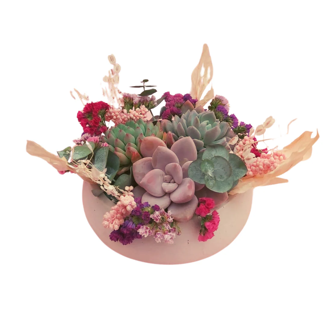 Arreglo suculento en base de concreto, combinando los que más nos encanta; Suculentas y naturaleza preservada. (Las especies utilizadas en el arreglo pueden variar según la disponibilidad)