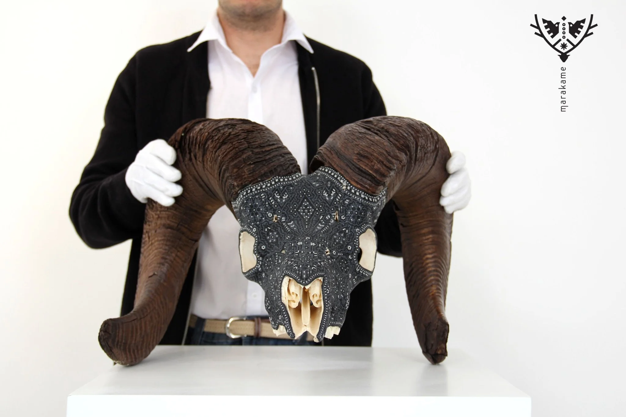 Piezas como los cráneos de cimarrón son posibles gracias al pegado de más de 30 mil micro chaquiras de cristal calibrado, una a una por las manos de los artistas Wixáritari. Cada pieza es única e irrepetible.