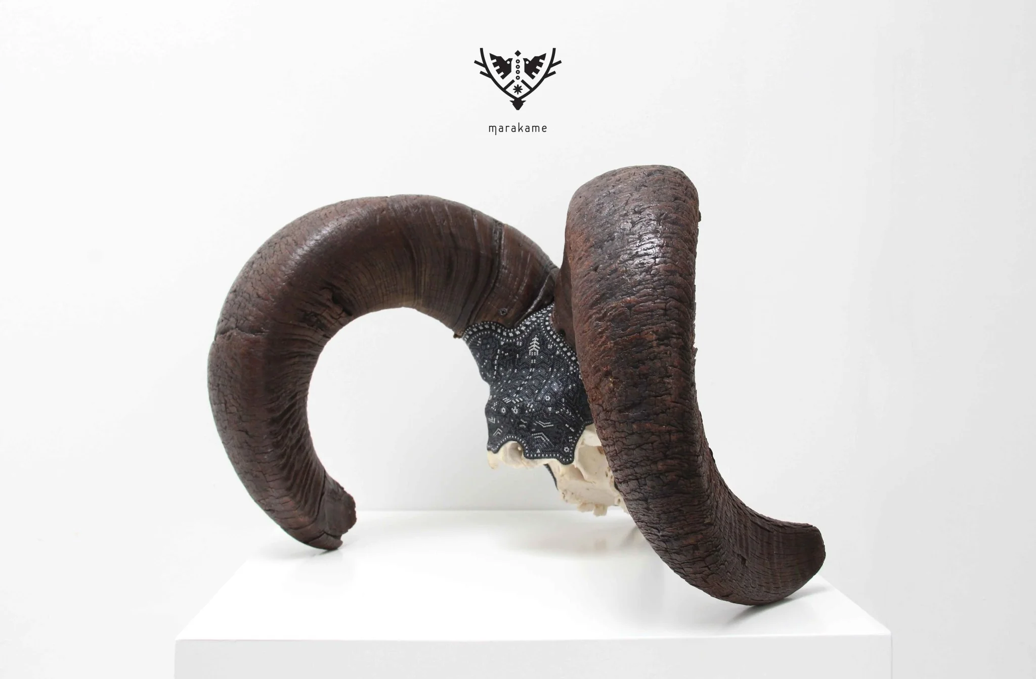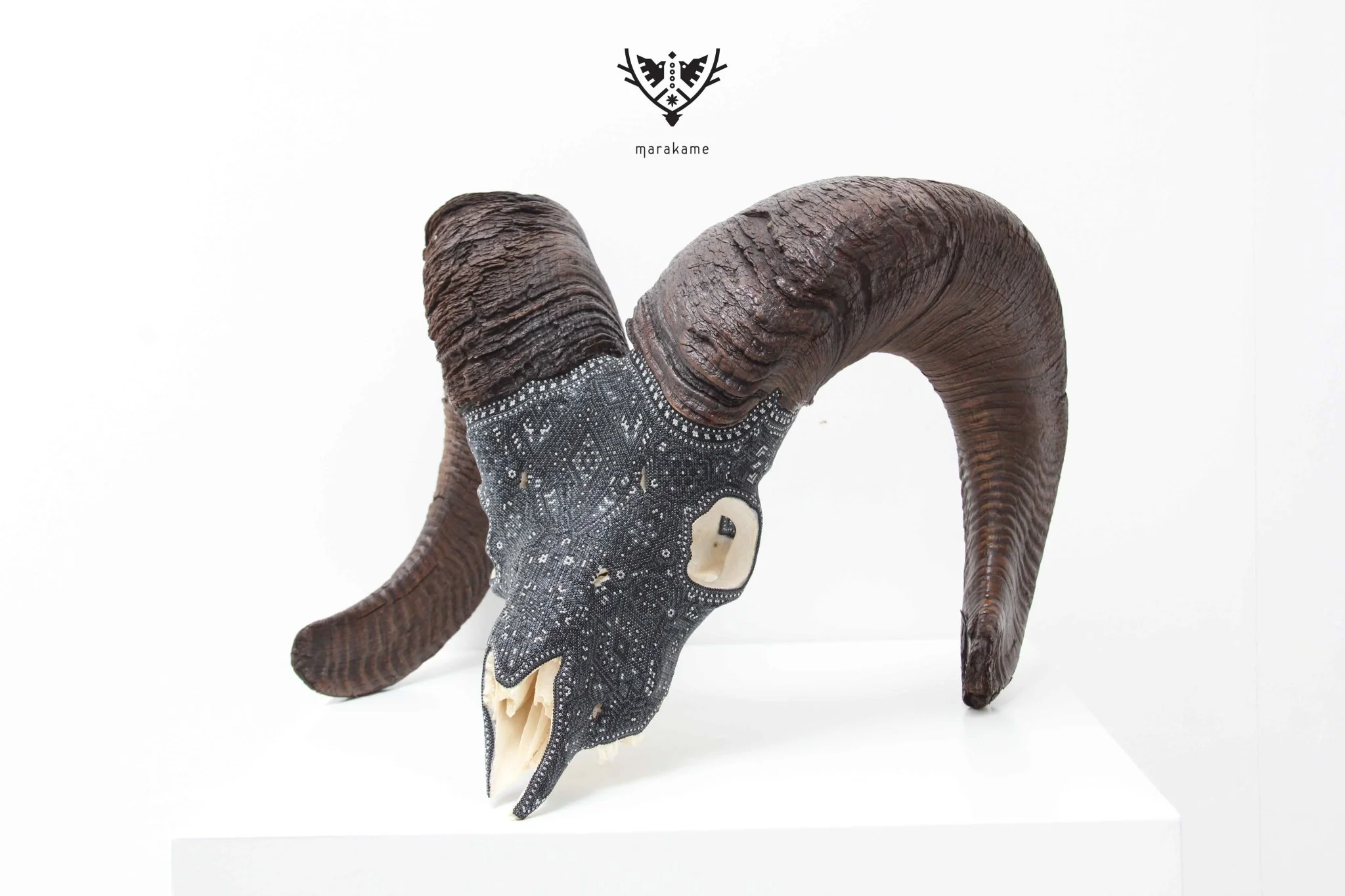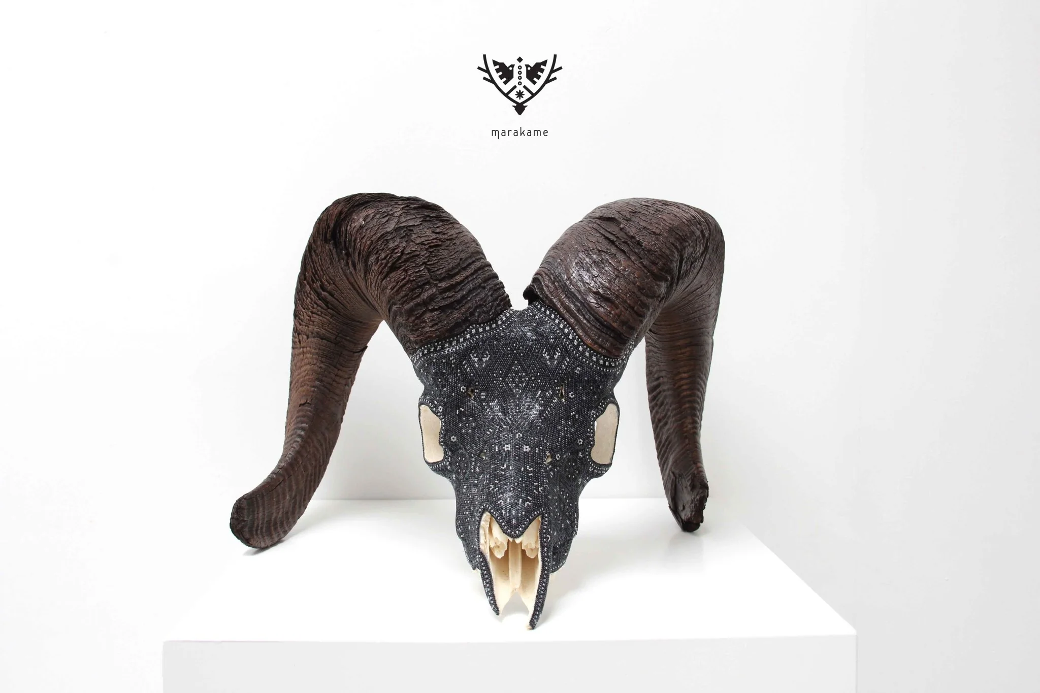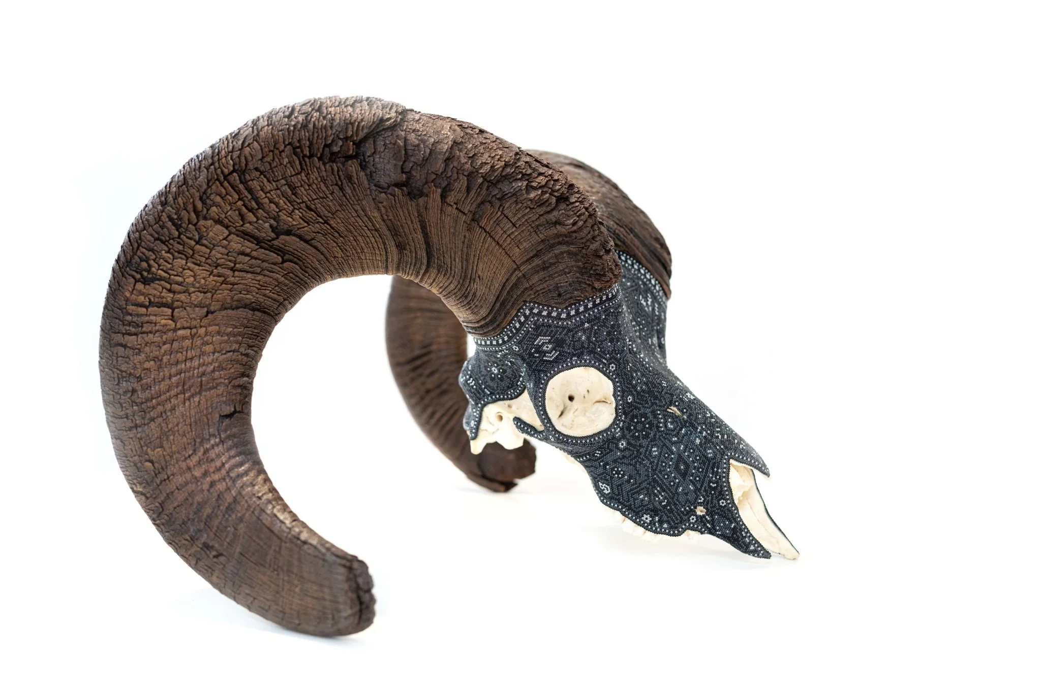 ◇ Técnica: Micro chaquira de cristal prensada con pegamento epóxico sobre cráneo de cimarrón.