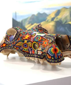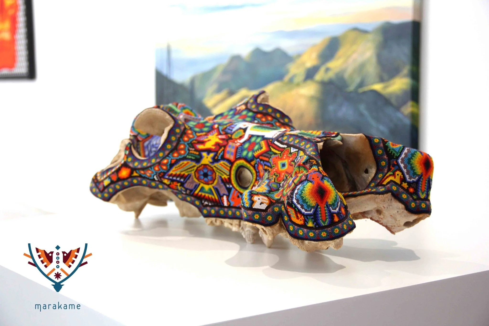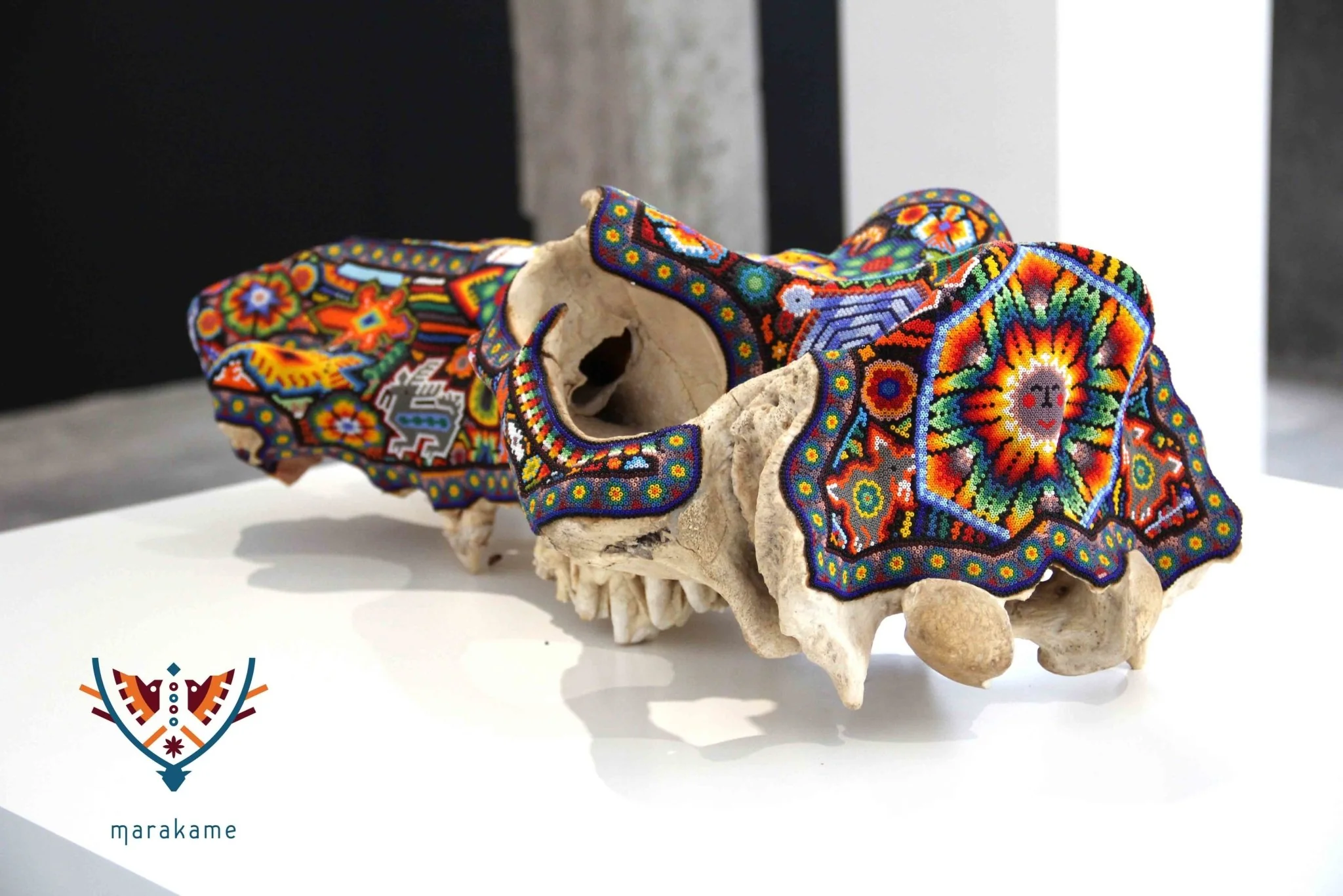 Piezas como los cráneos de hipopótamo son posibles gracias al pegado de más de 70 mil chaquiras de cristal calibrado, una a una por las manos de los artistas Wixáritari. Cada pieza es única e irrepetible.