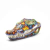 Este cráneo auténtico de hipopótamo es un verdadero tesoro natural, decorado con chaquiras de muchos colores que brindan un toque de elegancia y seriedad. Los detalles pequeños y los patrones geométricos que cubren la superficie del cráneo son testamento al gran trabajo artístico que ha sido invertido en su creación. El diseño único y detallista de este cráneo combina la naturaleza auténtica del hipopótamo con la creatividad y la habilidad de los artistas, creando un elemento decorativo que es tanto útil como bello.