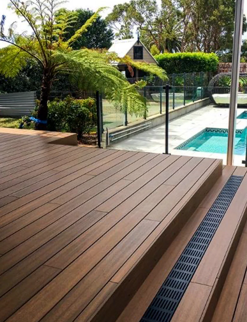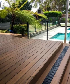 Deck Exterior Color Teca “El Deck CO-ESTRUXIÓN WPC para exterior está compuesto por 60% de resina de madera y 40% HDPE Polímero de alta densidad. Resistente a cambios extremos ambientales, ideal para lugares con altas temperaturas y exposición al sol prolongada así como lugares fríos, con lluvia y nieve.