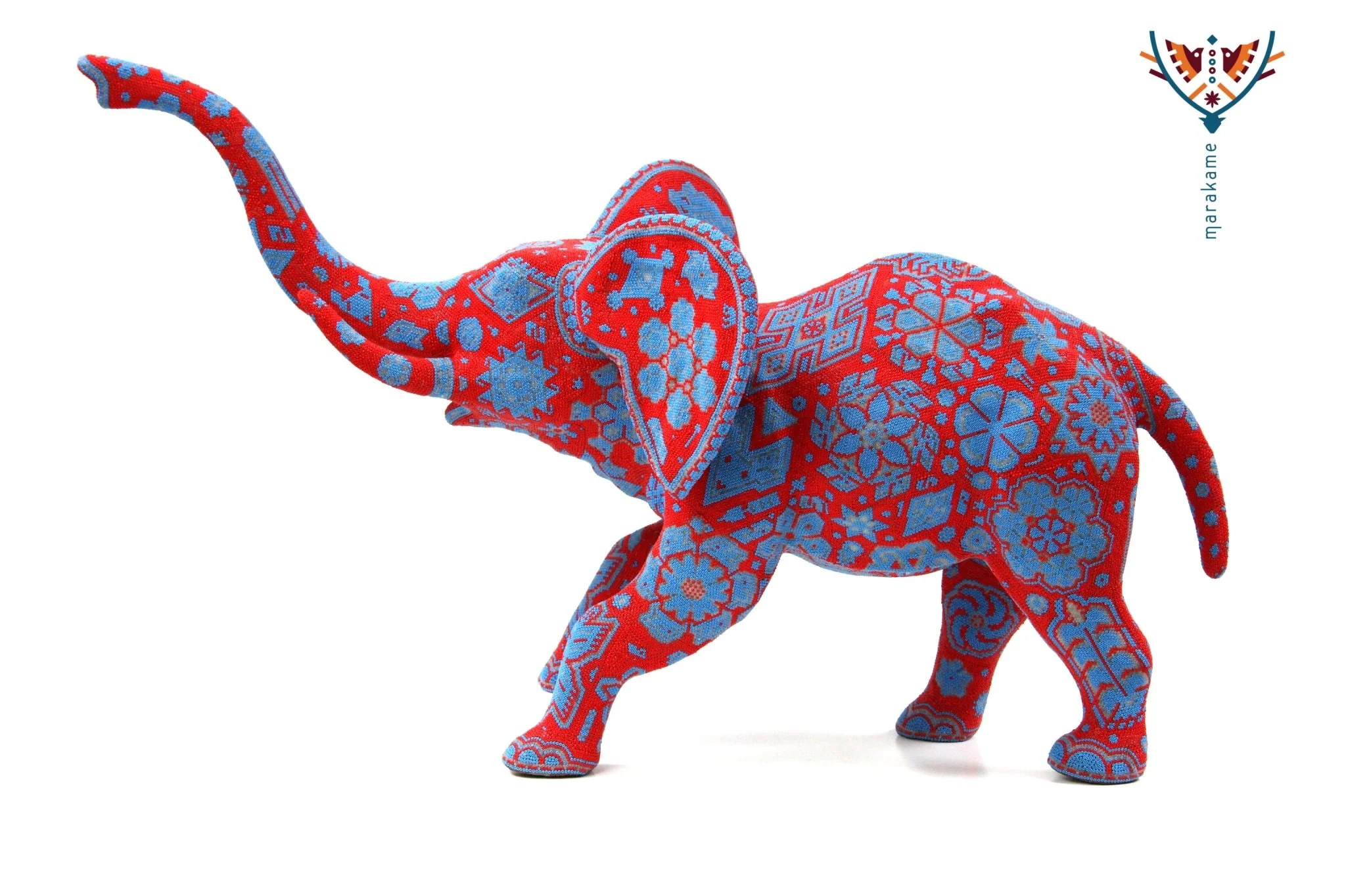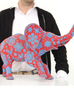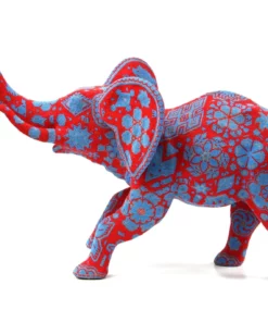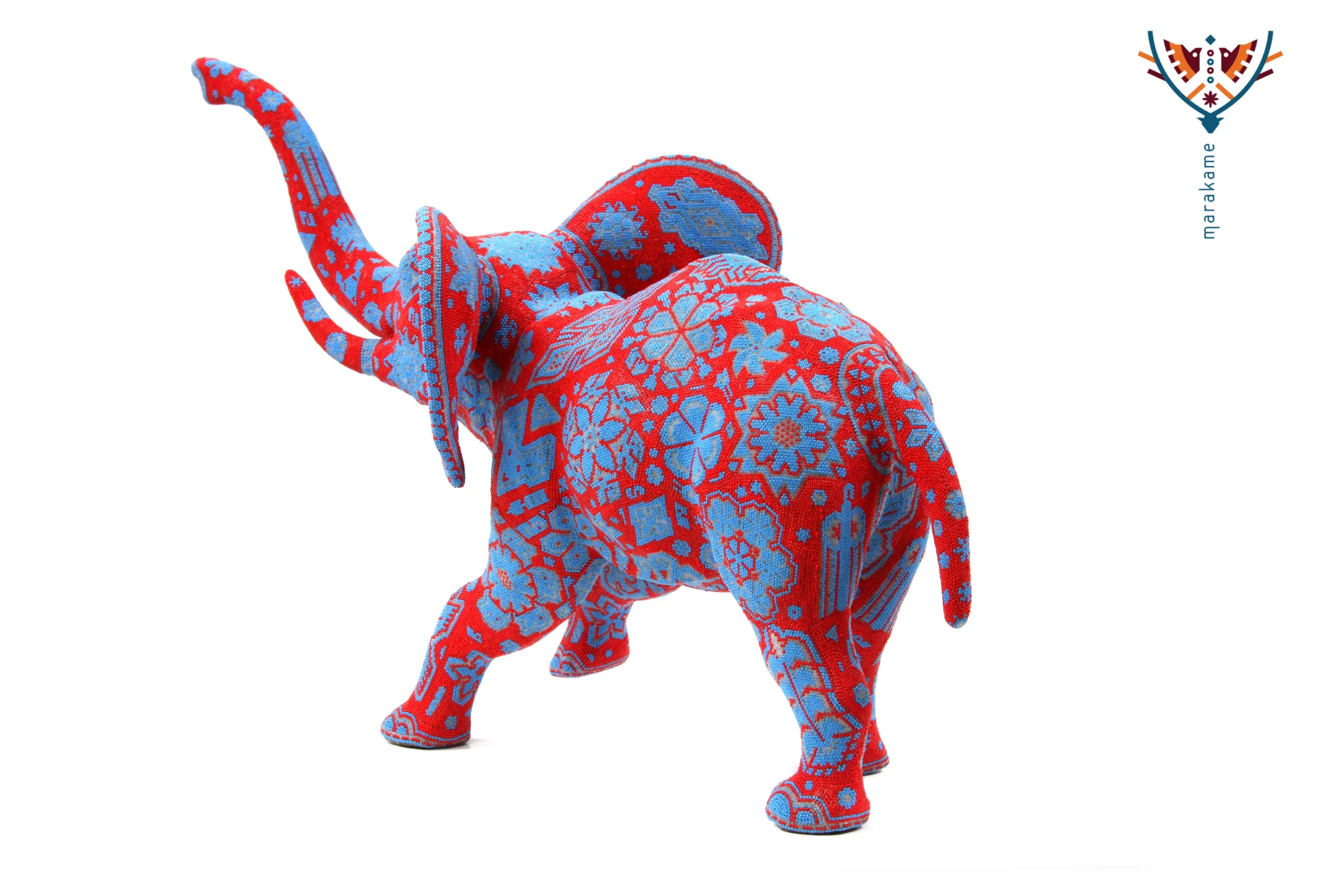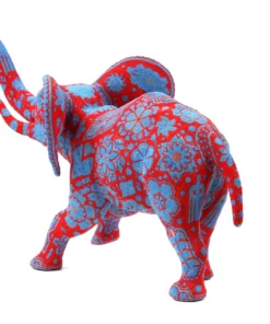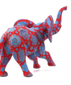 Este elefante está representado con expresión facial gritando, lo que le da un toque de energía y dramatismo. La pieza presenta colores rojos vibrantes y detalles azules que crean un contraste atractivo y llamativo.