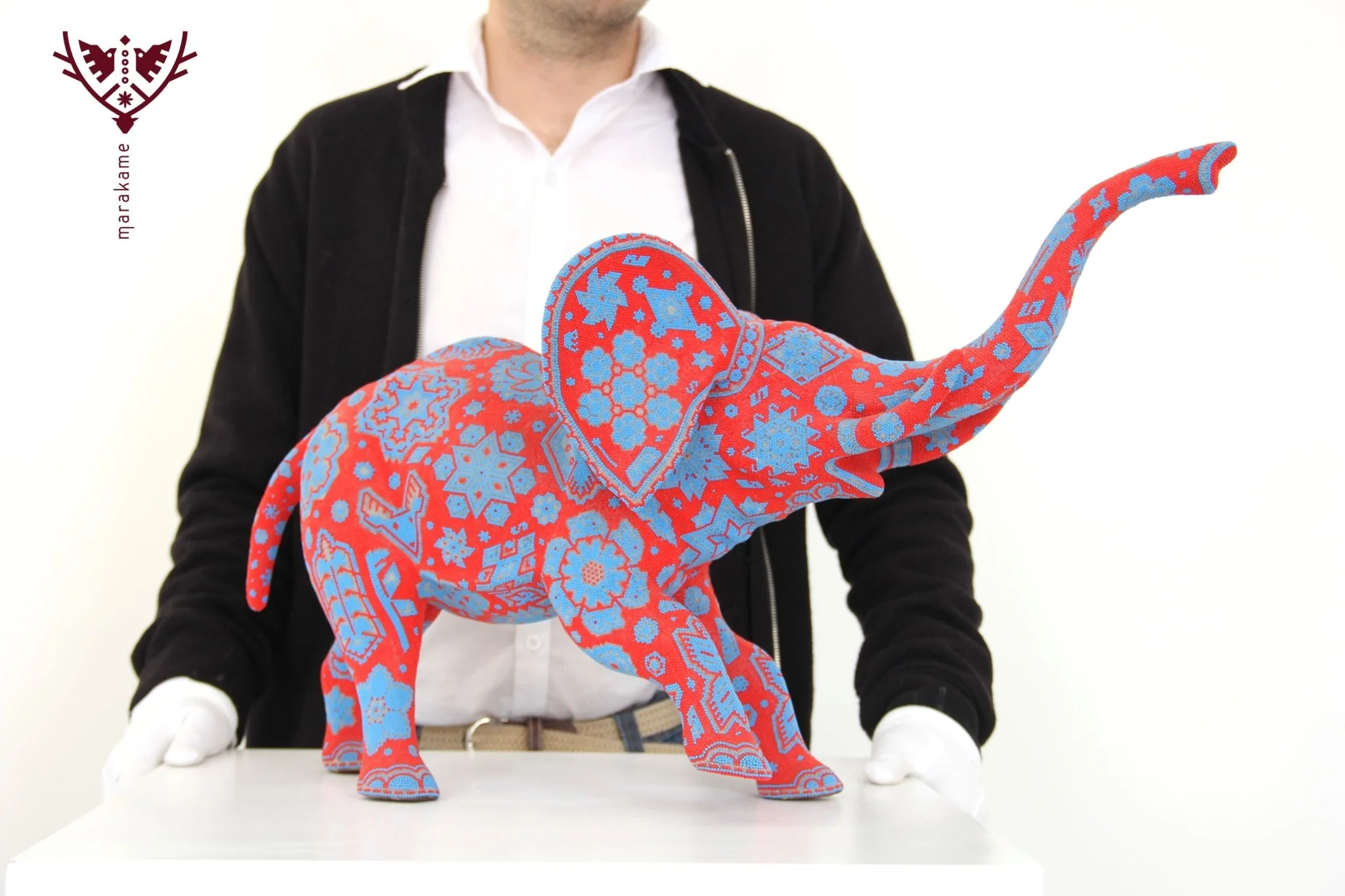 Marakame innova e integra las habilidades de los artistas Zapotecas, fusionando las piezas logradas por ellos con la destreza visual y manual de los Wixárika al pegar chaquiras de tamaño diminuto una a una, desde 20 mil hasta más de 500 mil (más de 70 mil en esta pieza), durante períodos que van de entre 15 y 300 días.