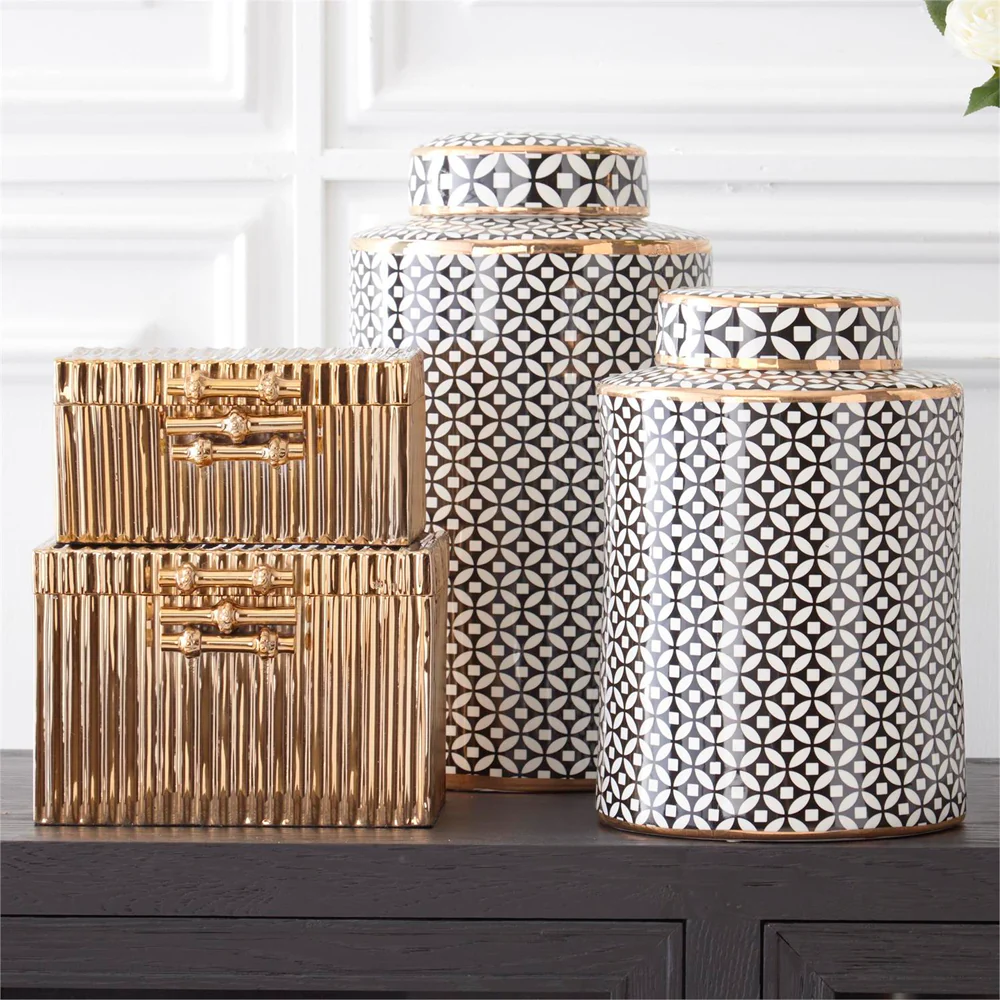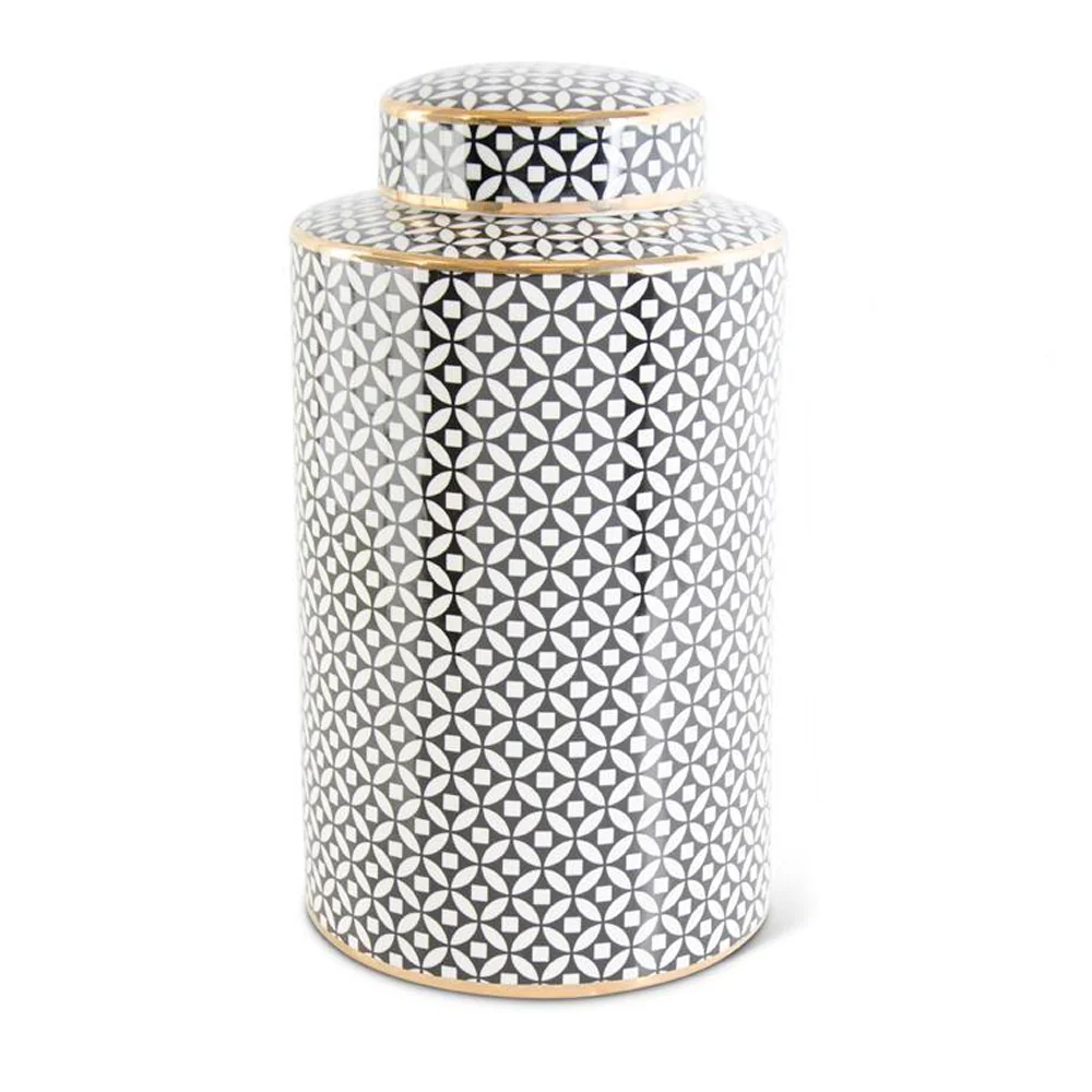 JARRON CIRCULAR CON TAPA CON PATRONES BLANCO Y NEGRO