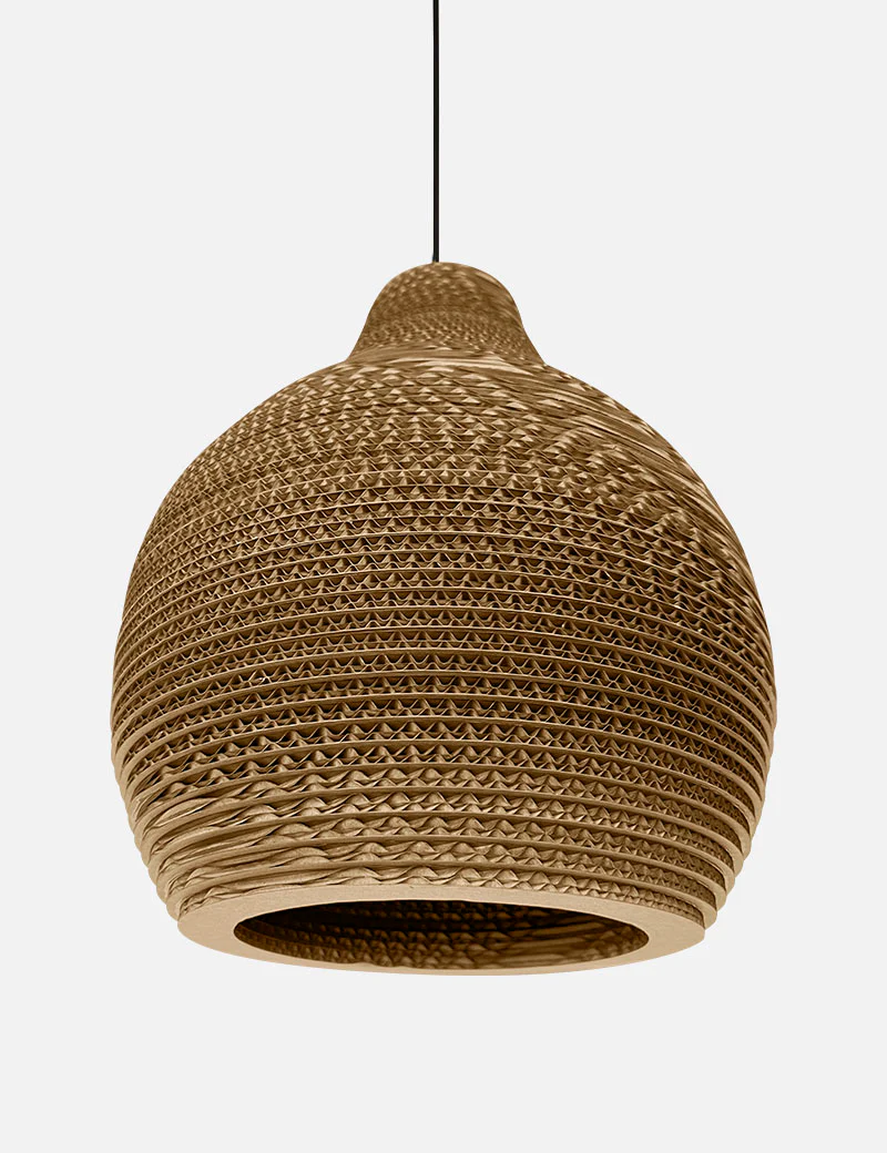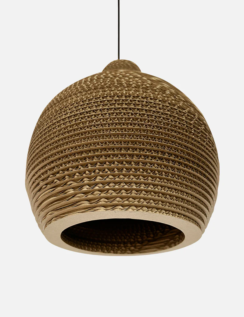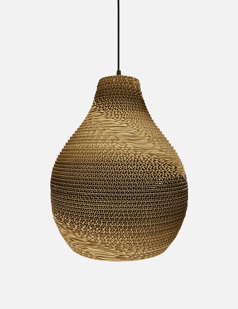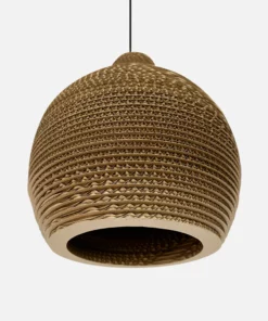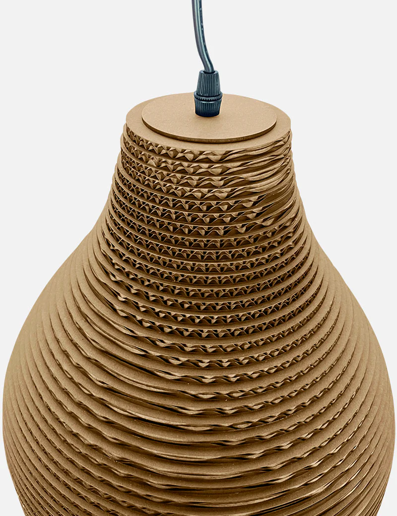 Lámpara colgante de corrugado, elegante y sostenible. Con dimensiones de 30cm X 37cm, está elaborada completamente de materiales 100% biodegradables, fusionando diseño moderno con conciencia ambiental. Ilumina tus espacios con estilo y responsabilidad ecológica.