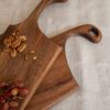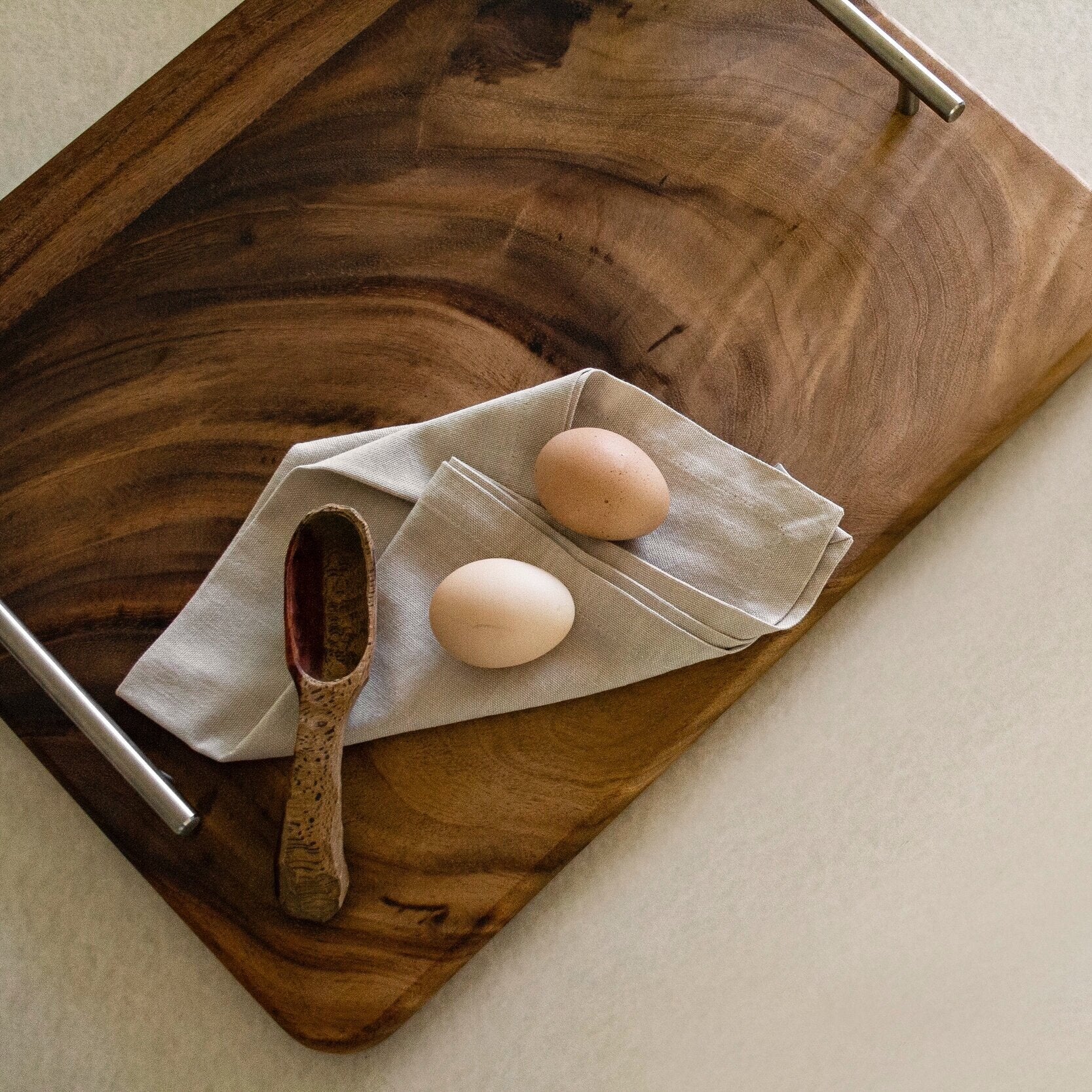 Charola elaborada en madera de parota con agarraderas de metal cuadra con cera de abeja de grado alimenticio.
