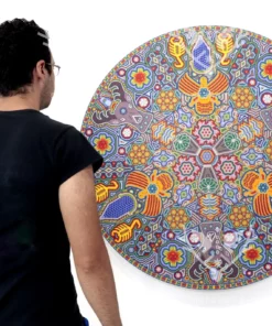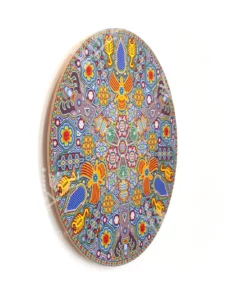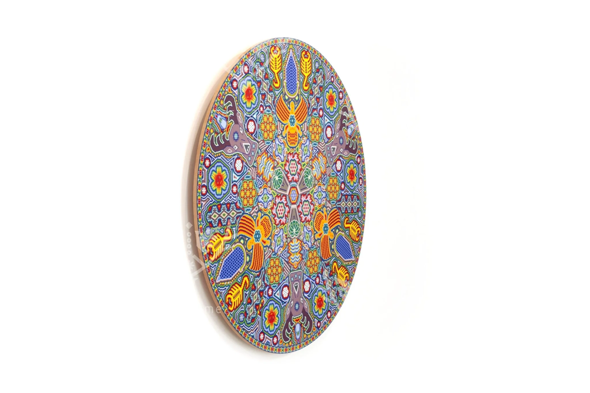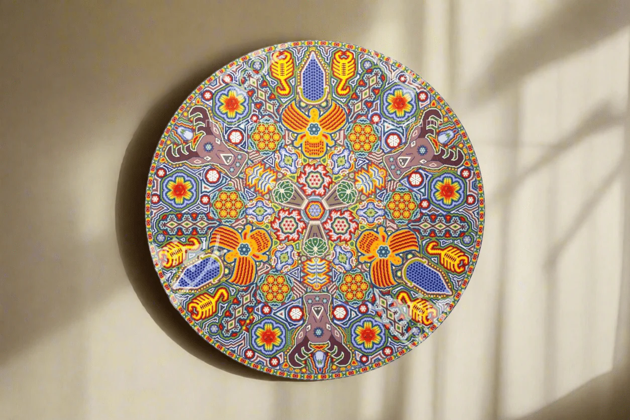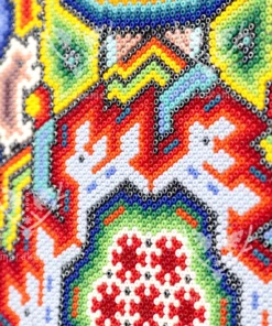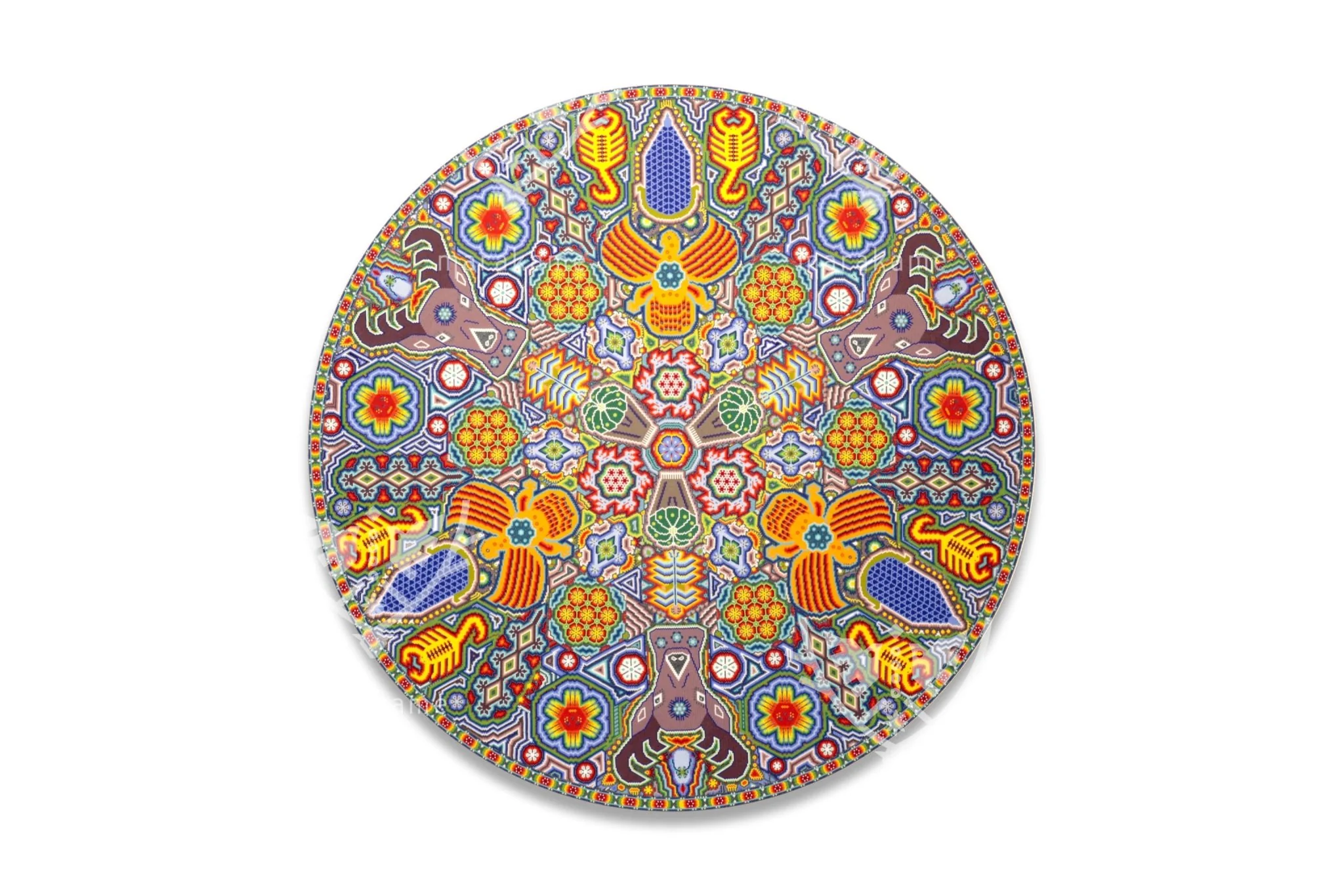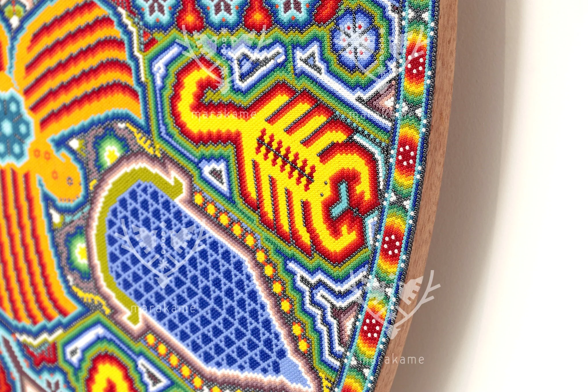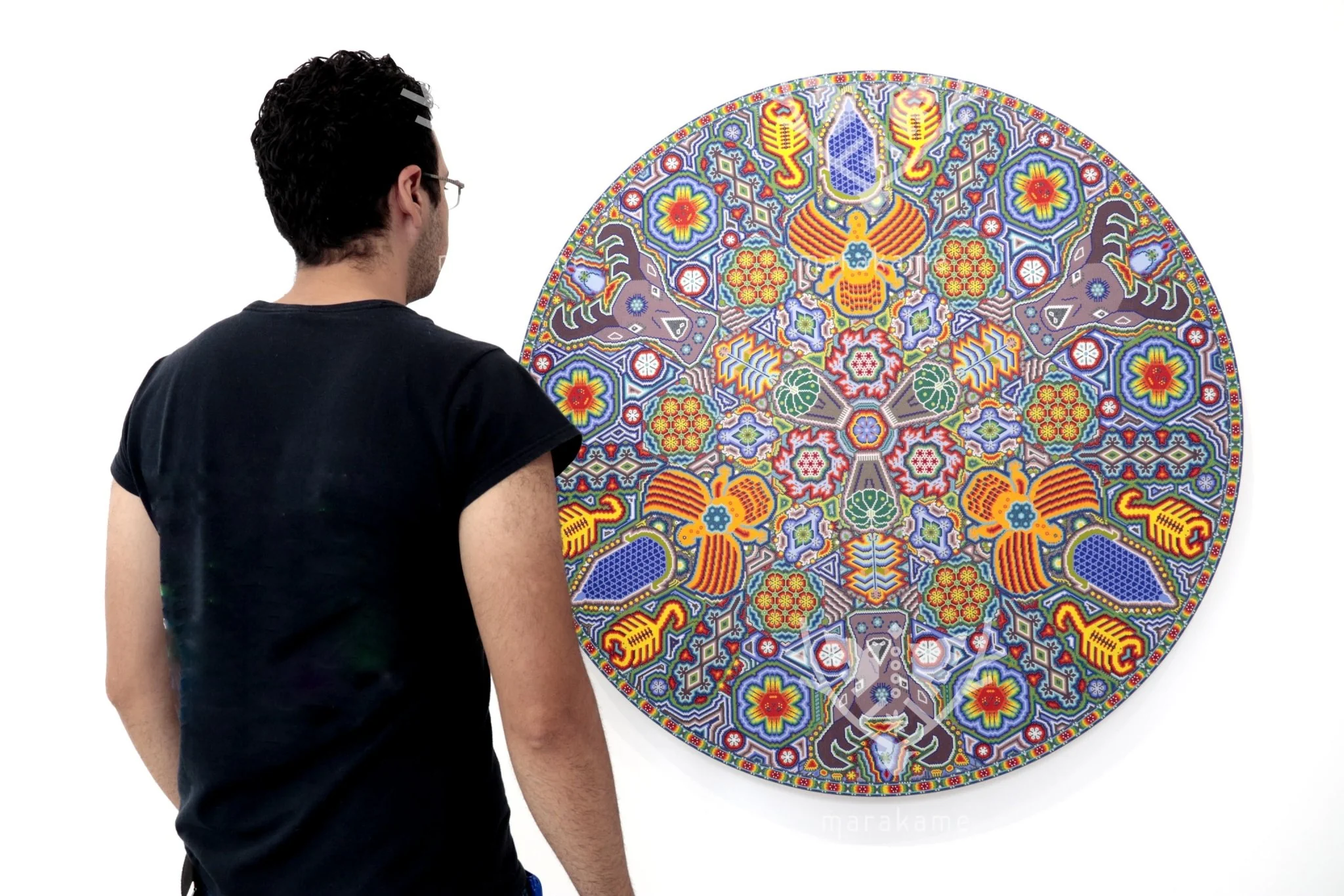 – Más de 280,000 chaquiras prensadas una por una en esta pieza.En Marakame trabajamos con artistas Wixárika innovadores que en esta ocasión han realizado un círculo intervenido con la técnica de chaquira. En cualquier caso, abordando la narrativa de su costumbre tradicional mediante la simbología más representativa de su cosmovisión.