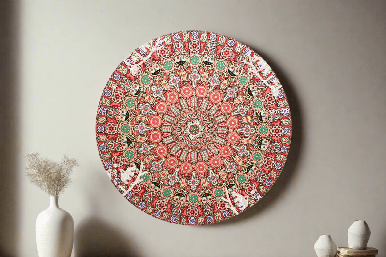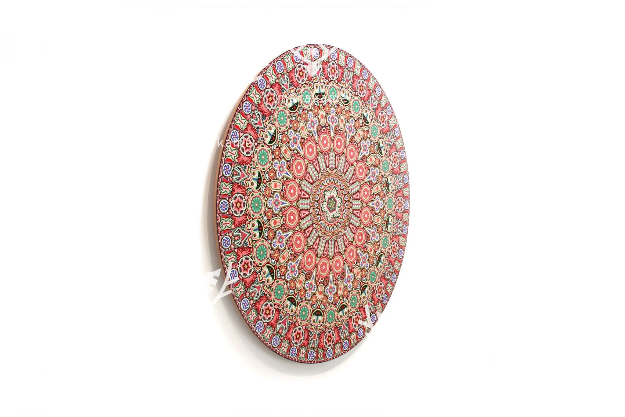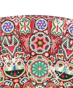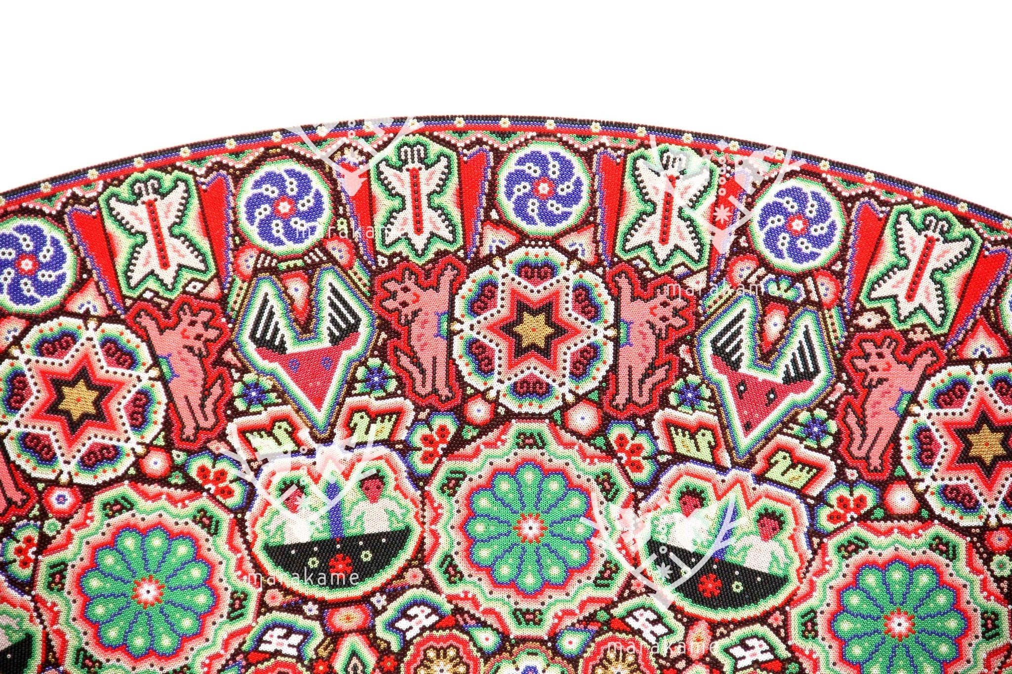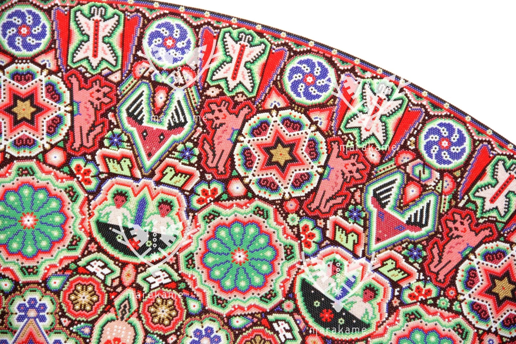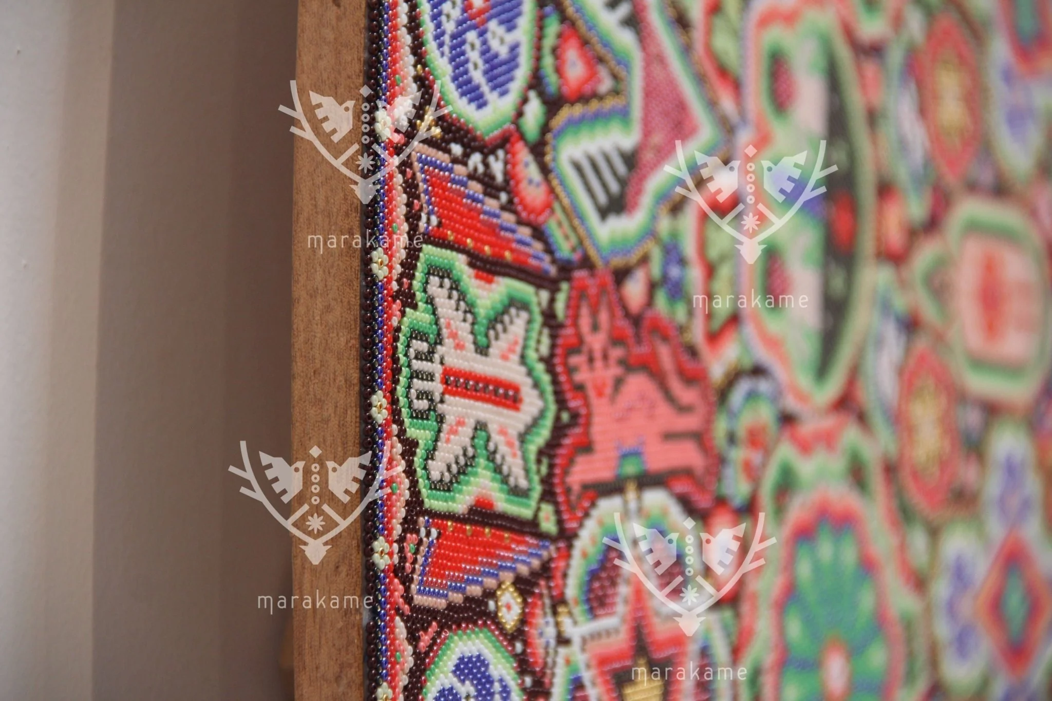 – Más de 500,000 chaquiras prensadas una por una en esta pieza.En Marakame trabajamos con artistas Wixárika innovadores que en esta ocasión han realizado un círculo intervenido con la técnica de chaquira. En cualquier caso abordando la narrativa de su costumbre tradicional mediante la simbología más representativa de su cosmovisión.