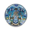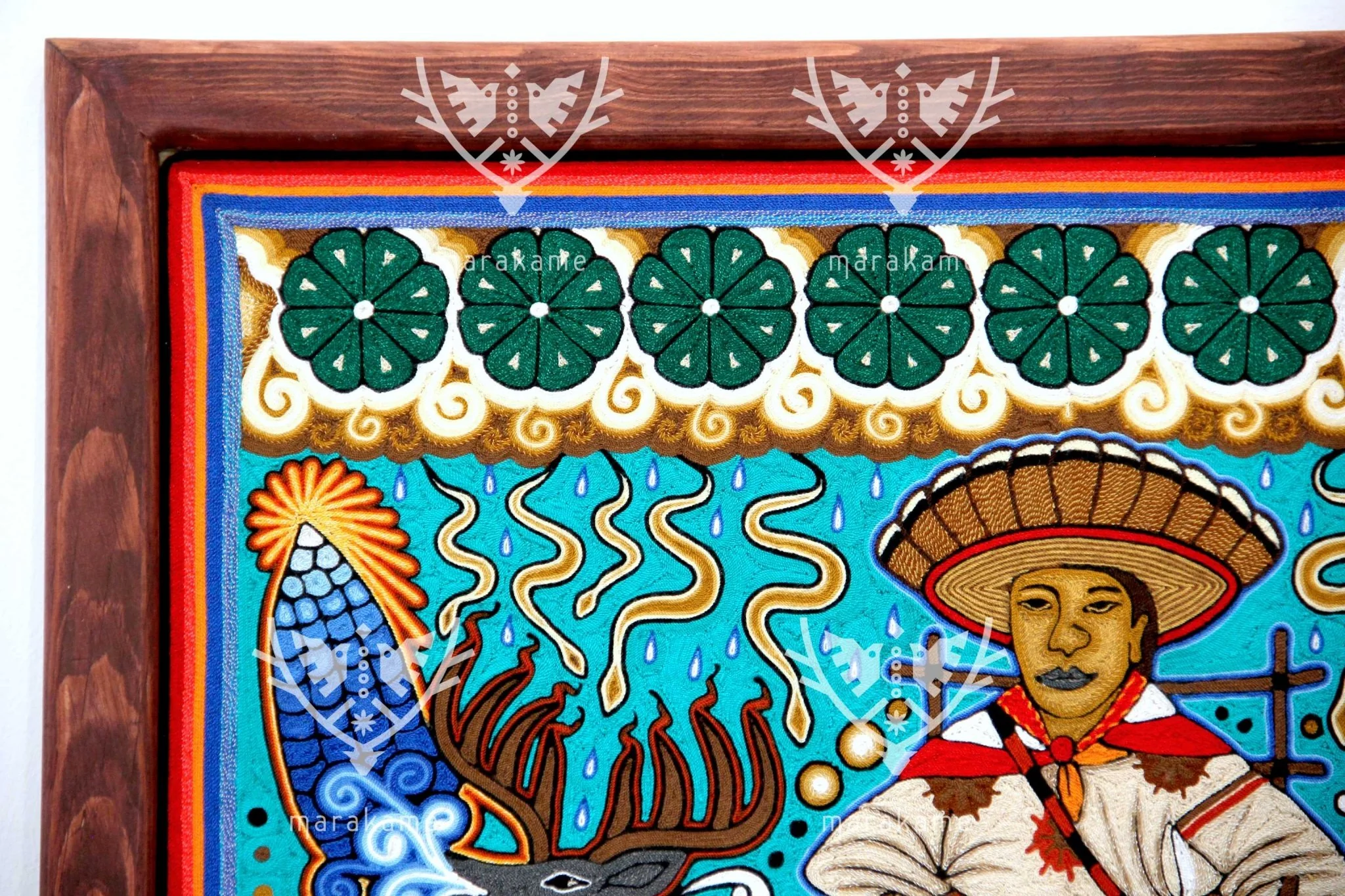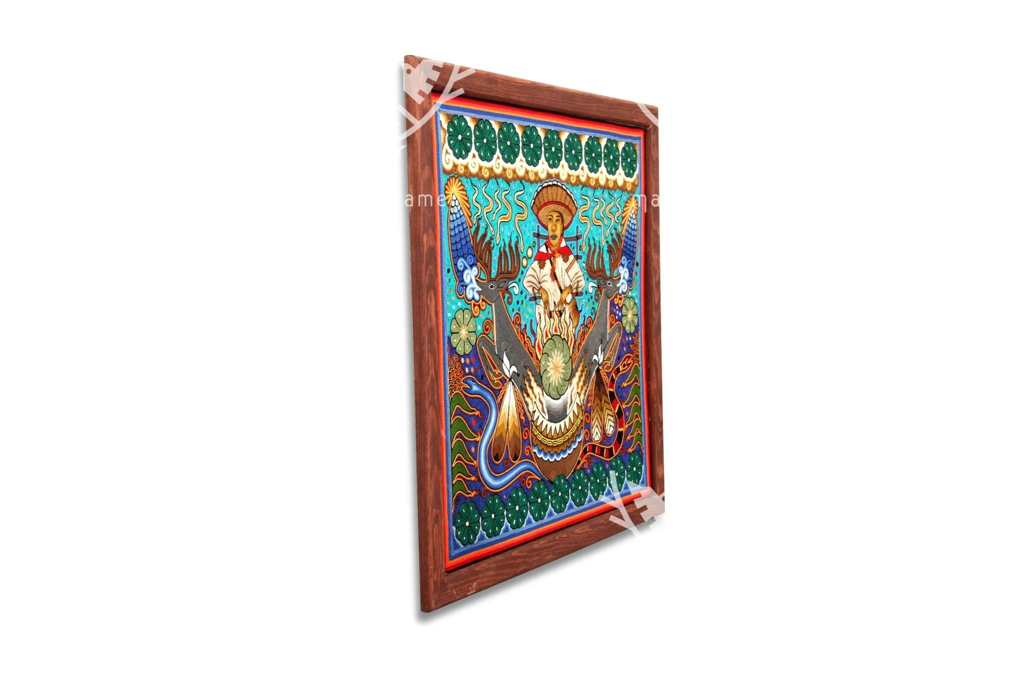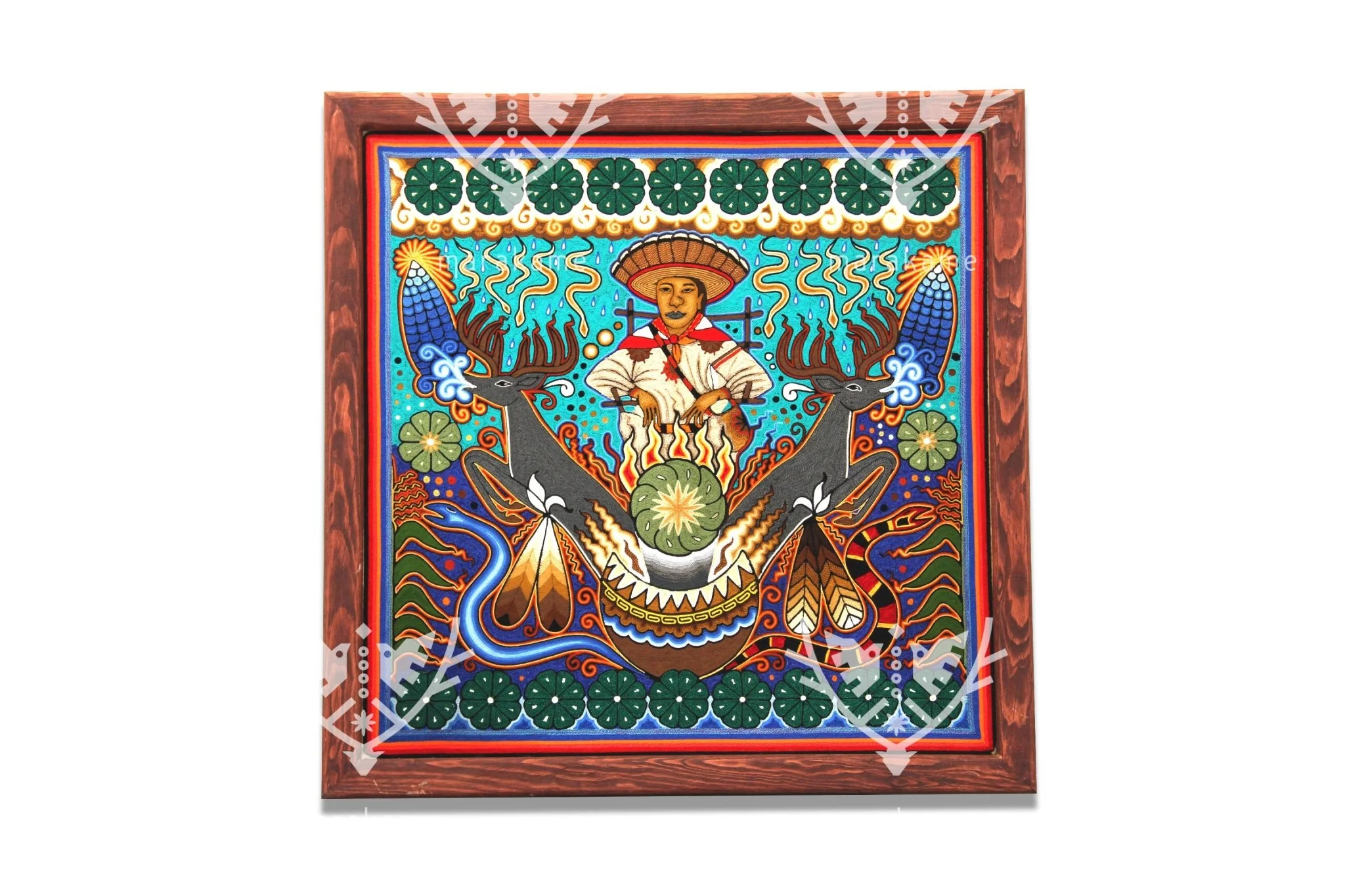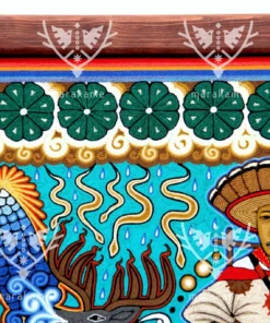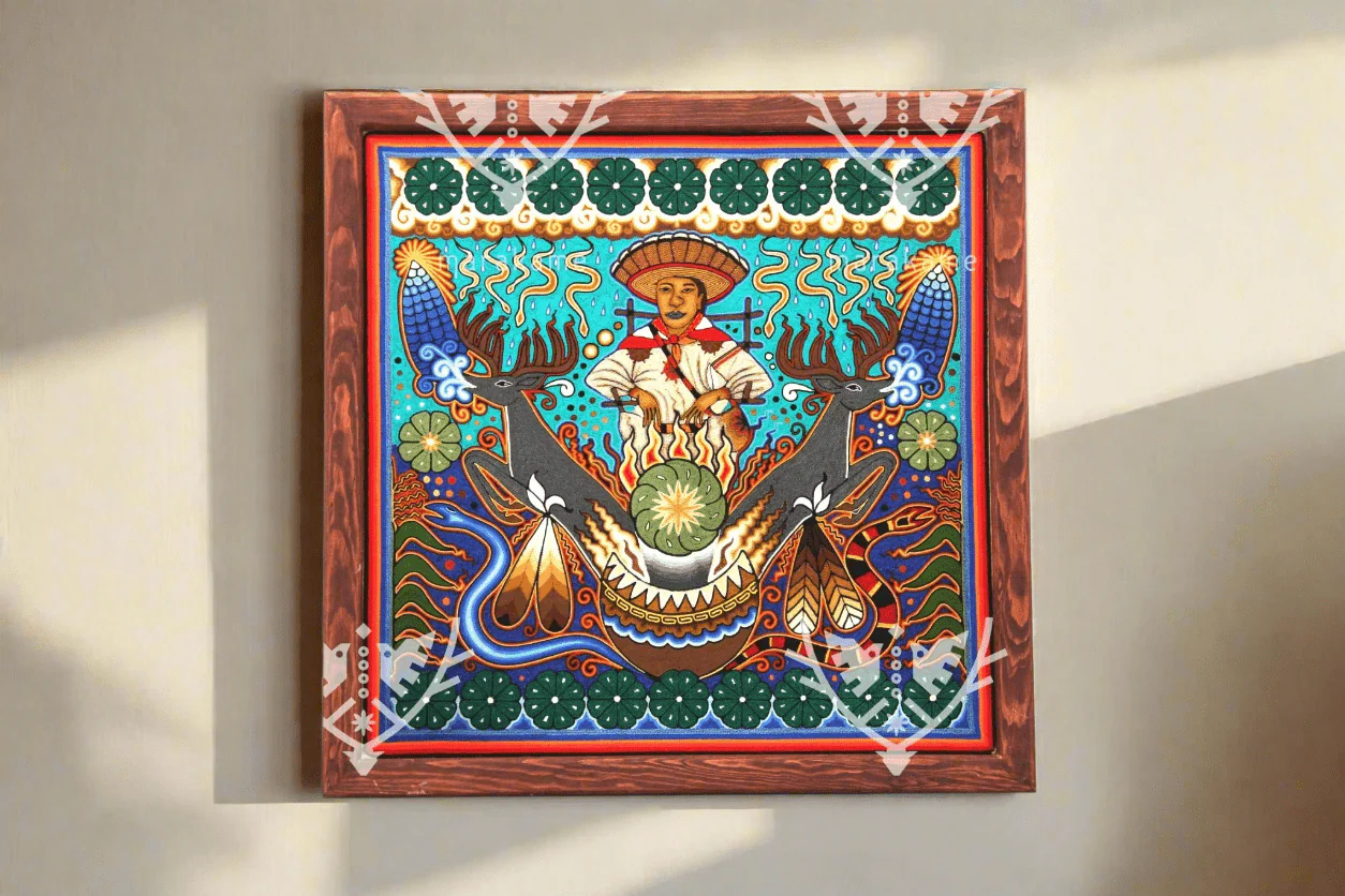 Las obras utilizan una variante de hilo distinta al resto de los cuadros de estambre, lo que permite a los artistas emplear una gama cromática más amplia, aportando carácter y atmósfera a las complicadas escenas y composiciones, ya sea en formatos redondos o rectangulares.En el centro del cuadro, un huchol sentado en un círculo nos invita a entrar en su mundo espiritual. Debajo de él, un caldero de fuego arde, simbolizando la energía y la sabiduría. A los lados del caldero, dos venados majestuosos se encuentran en quietud, representando la conexión con la naturaleza. En la parte superior e inferior del cuadro, simbolos del peyote nos recuerdan la importancia de la conexión con la naturaleza y el espíritu.