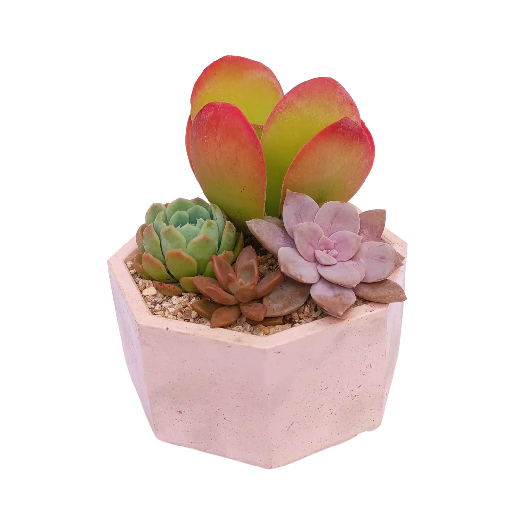 Composición suculenta en maceta de concreto en forma de octágono decorado con tres suculentas medianas, una pequeña y piedrita de mármol. (Las especies utilizadas en el arreglo pueden variar según la disponibilidad)