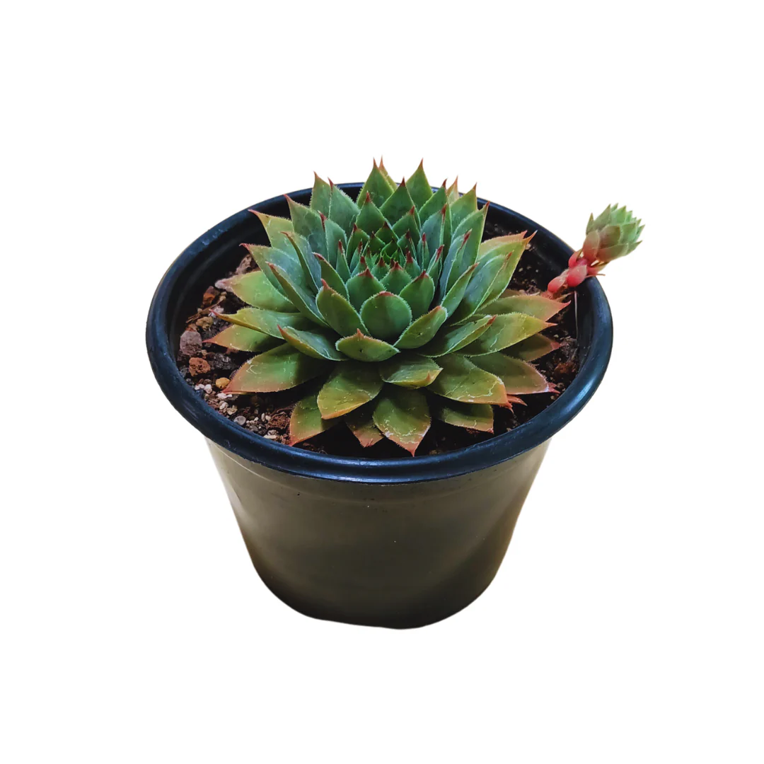 Planta suculenta en maceta de plástico de 3 y 4 pulgadas con sustrato especial.