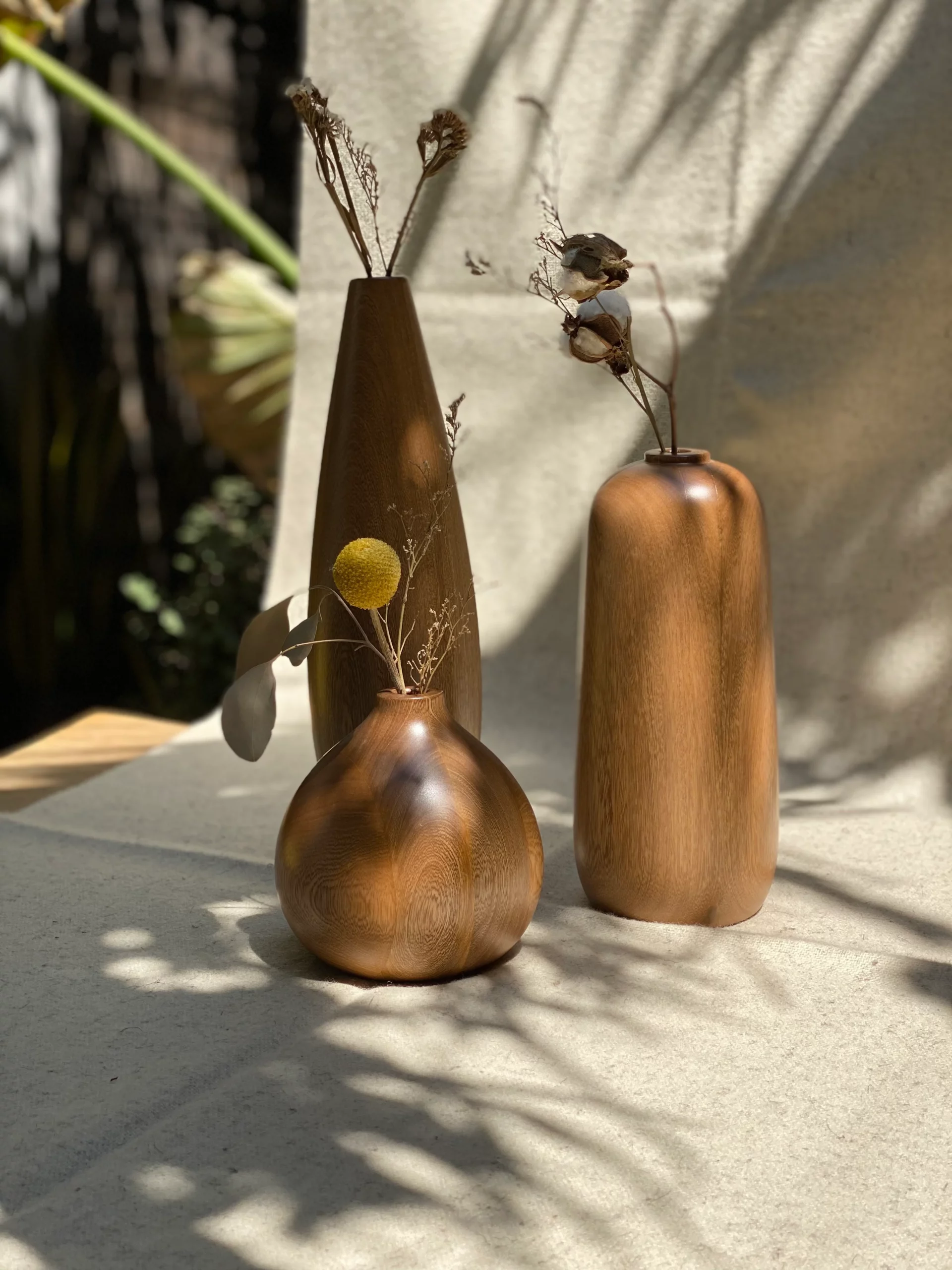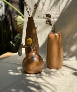 Set de Floreros Almendra, Piñón y Macadamia en madera Rosa morada torneados por artesanos de Jalisco