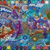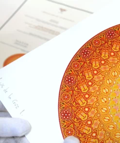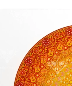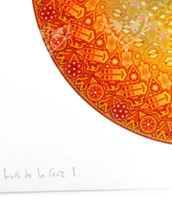 En Marakame trabajamos con artistas Wixárika innovadores que en esta ocasión han realizado un círculo intervenido con la técnica de chaquira. En cualquier caso abordando la narrativa de su costumbre tradicional mediante la simbología más representativa de su cosmovisión. Tiene más de 550,000 chaquiras de cristal colocadas una por una la obra original.