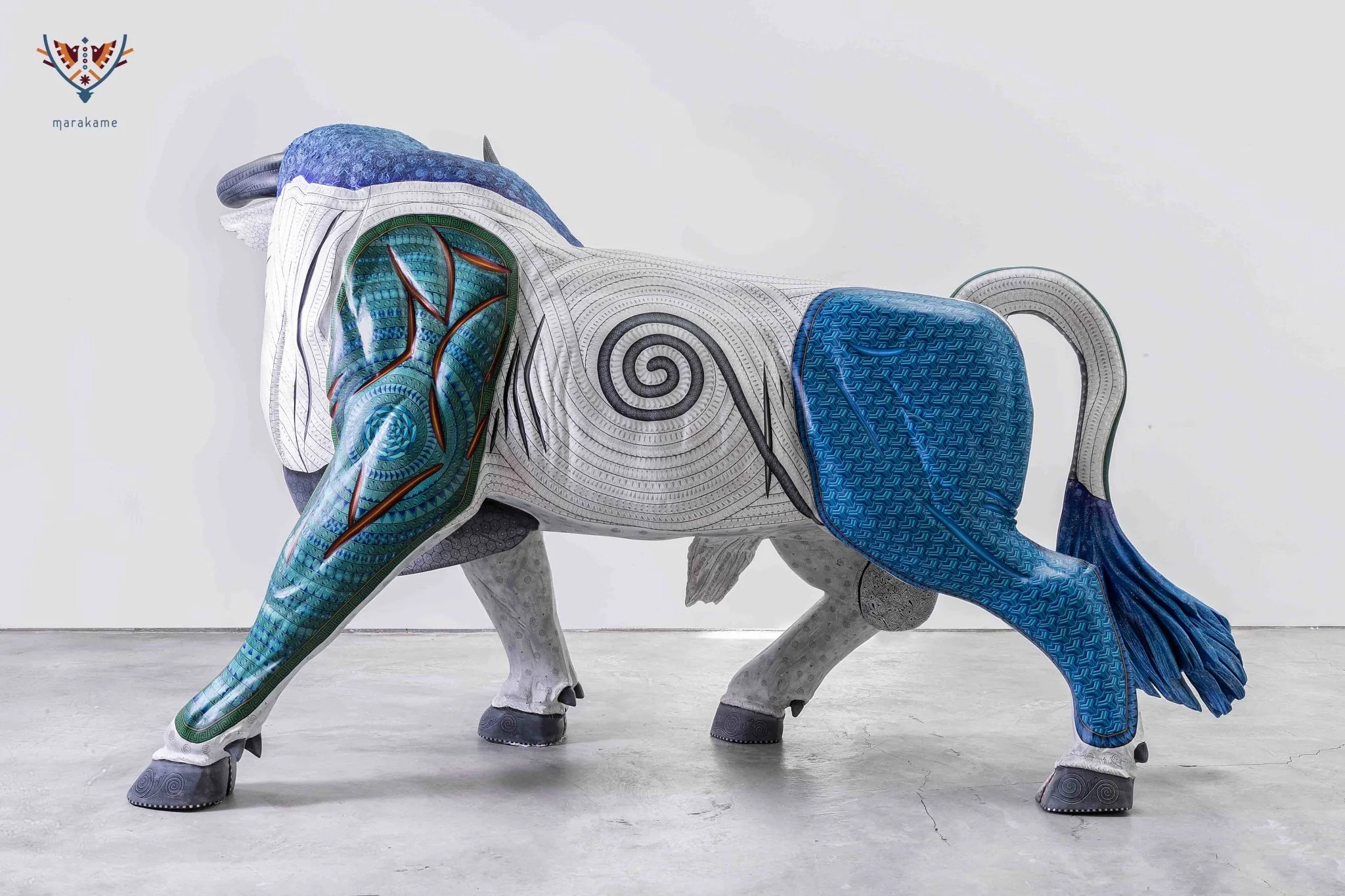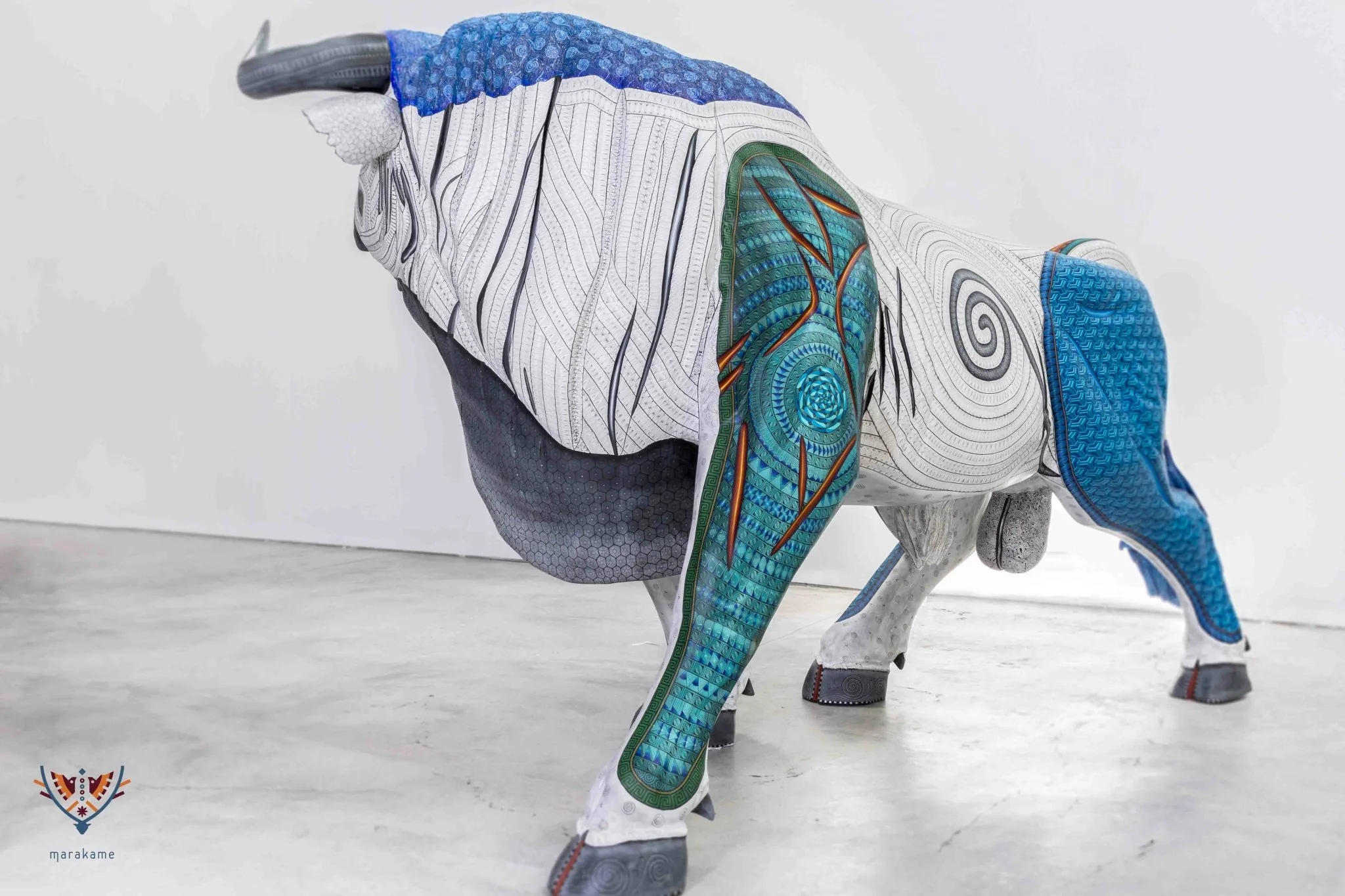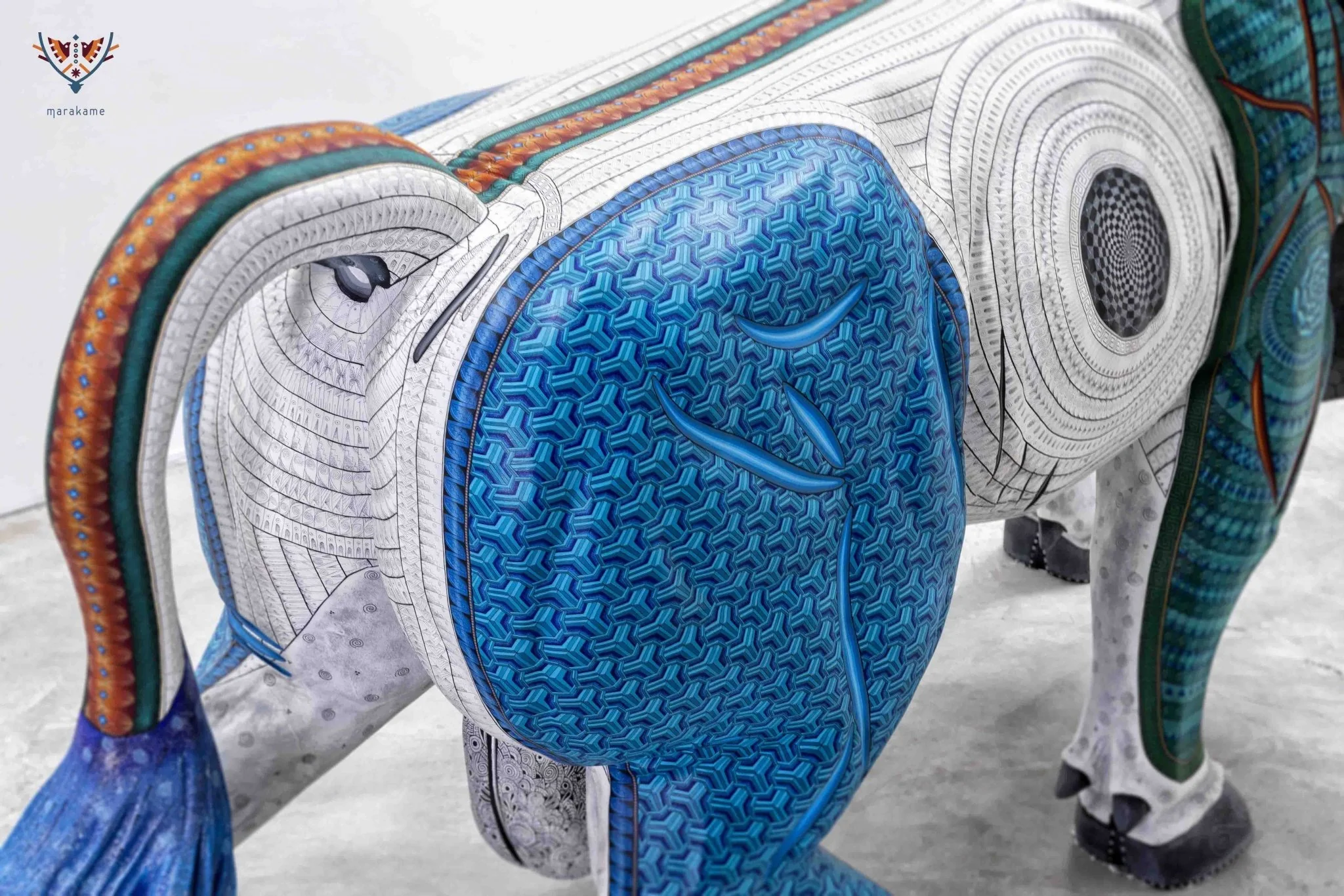 Desde 2017, en Marakame llevamos a cabo la dirección creativa de figuras zapotecas —cuyo nombre originario es “tonas” o “nahuales”—, comisionadas a los mejores autores de alebrije contemporáneo. El Toro de Lidia Imperial es una obra colectiva que se talló en madera de cedro y fue pintada a mano durante 11 meses. Pero es gracias a un proceso de 4 años que ha sido posible, pues las diferentes etapas que requirió —incluyendo el tallado, secado, decorado y sellado— se cuidaron de manera cuidadosa y cercana. Por ello se trata de un “Tona” irrepetible y excepcional, algo difícil de hallar.